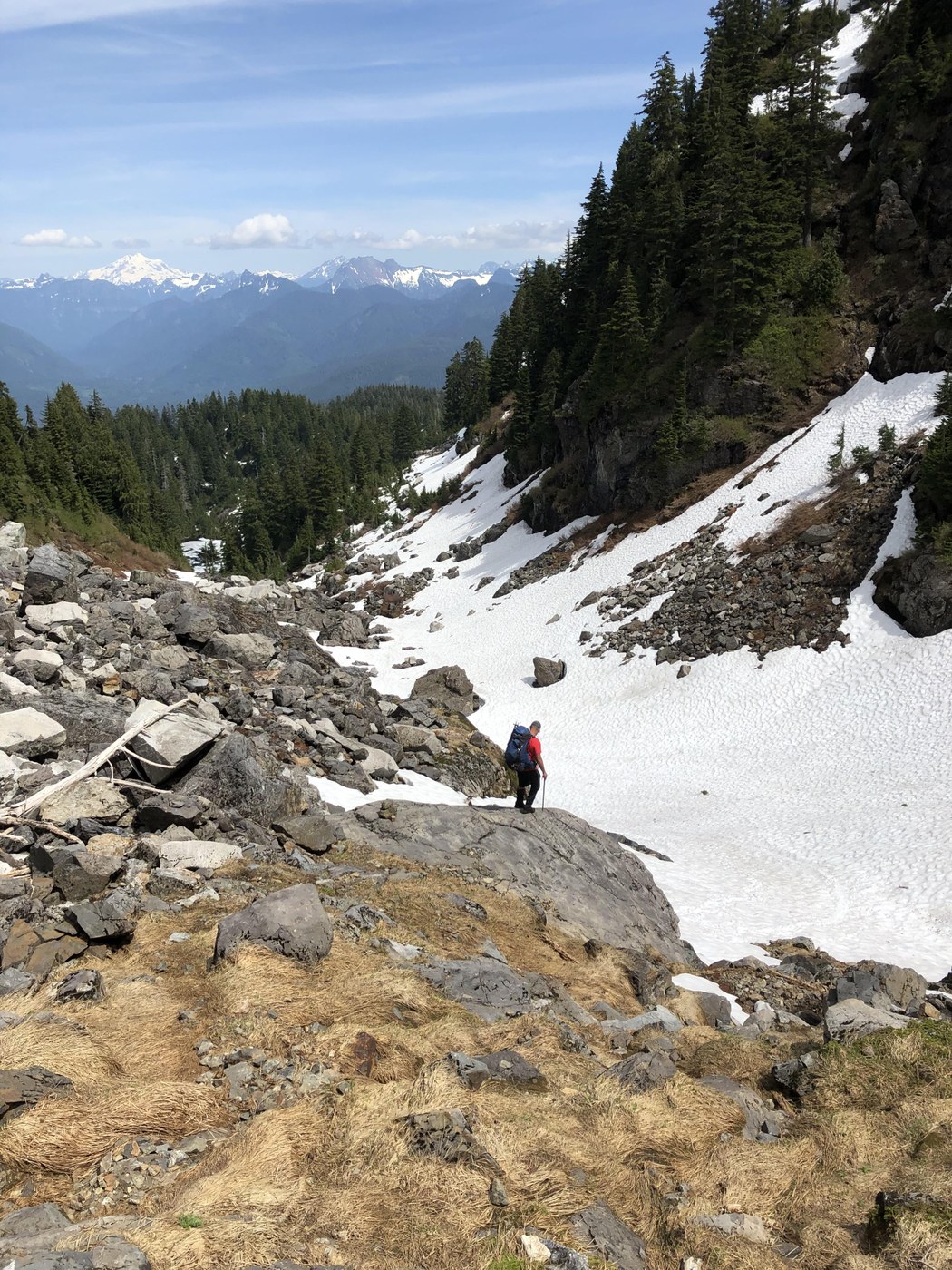 The start of the boulder field leading into Iodine Gulch is melting out quickly, leaving rotten snow, snow bridges, and some fun surprise drops if you don't test your footing. We stuck to the normal trail that crosses the creek to the far side of the gulch, which just like the lakeside trail is a mess of matted-down shrubbery that has been exposed by recent snowmelt. The gulch sucks. More veggie belays, devils club, snow bridges, and steep, loose terrain. The snow up the middle of the gulch didn't look reliable enough to ascend, and there is a significant amount of water running underneath. The guys stuck to the right of the rock outcropping and reported that it was "sketchy as f*ck" with sections that were slick and offered essentially no traction or protection. I tucked left along the rock and found some reasonable steps up boulders that while slick and muddy, still allowed for reasonably safe passage. The snow crossing at the top of the gulch was pretty solid still, although having an ice axe for self-arrest would be ideal (we did) since a slip here would send you a long way down into a soft, boulder-y landing. 10/10 would not recommend.