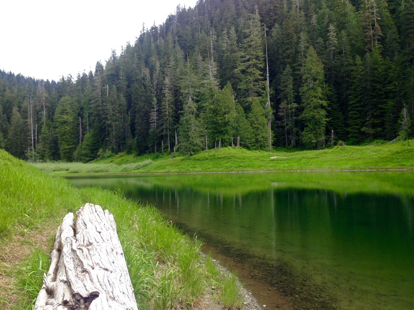 Satsop Lake is pretty, tranquil, and relaxing, but it is hardly breathtaking. It does look like it would be a good place for a swim on a warm day, but I didn't indulge. I followed the trail beyond it and in a fairly short distance (less than 1/2 mile) it came out to another forest service road and trailhead where a family with fishing rods was just arriving. Kind of deflating in a way to know that others can simply drive up to a lake that you just hiked up and over a saddle to reach, and must return that way!