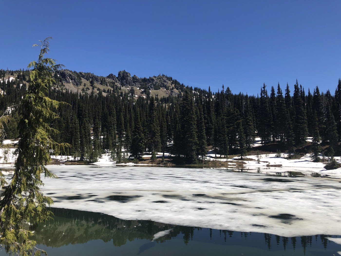 Plan was to hike at Naches Peak loop trail but there was too much snow so we decided to go to Sheep Lake instead. Trail mostly clear until you get up into the woods. Easy to lose the trail once in the woods , strongly recommend having a GPS with you until the snow melts. Got to the lake with relatively no problems, had to hunt for the trail a small amount. Coming down was more difficult, lost the trail due to snow & had to utilize the GPS to get back on trail. It’s easy to understand how people can get lost in Rainier when there is still snow on the ground and the trail is not obvious. Other than the snow, it was a beautiful day for a hike. The ice is melting on the lake, you can see a few small fish swimming but there were a few annoying flies were buzzing around our heads as we sat at the lake.