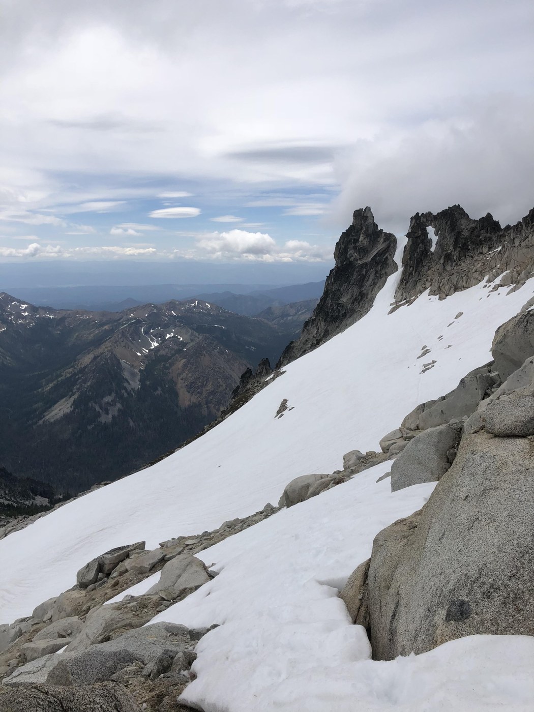Colchuck Peak to Dragontail Peak via Pandora’s Box Notch: Traced our steps back to the Col and then headed up to the notch. The first couple hundred feet was snow free and garbage loose sand/rock, with one step forward and sliding half back. It was definitely an energy sap. Once we reached the snow we put crampons back on to head up. Pretty steep but good snow with the weather we had. It was getting thin in some areas where it was easy to punch through or hit ice. Currently the snow is consistent enough to keep traction on. We topped out on the notch and there was a nice steep down climb waiting for us. The snow was good and there were excellent kick steps, so it was a fairly easy go with crampons/ice axe. Easy walk across the snow to Dragontail. We took our crampons off and scrambled up to the true summit. Once again it was an easy scramble.