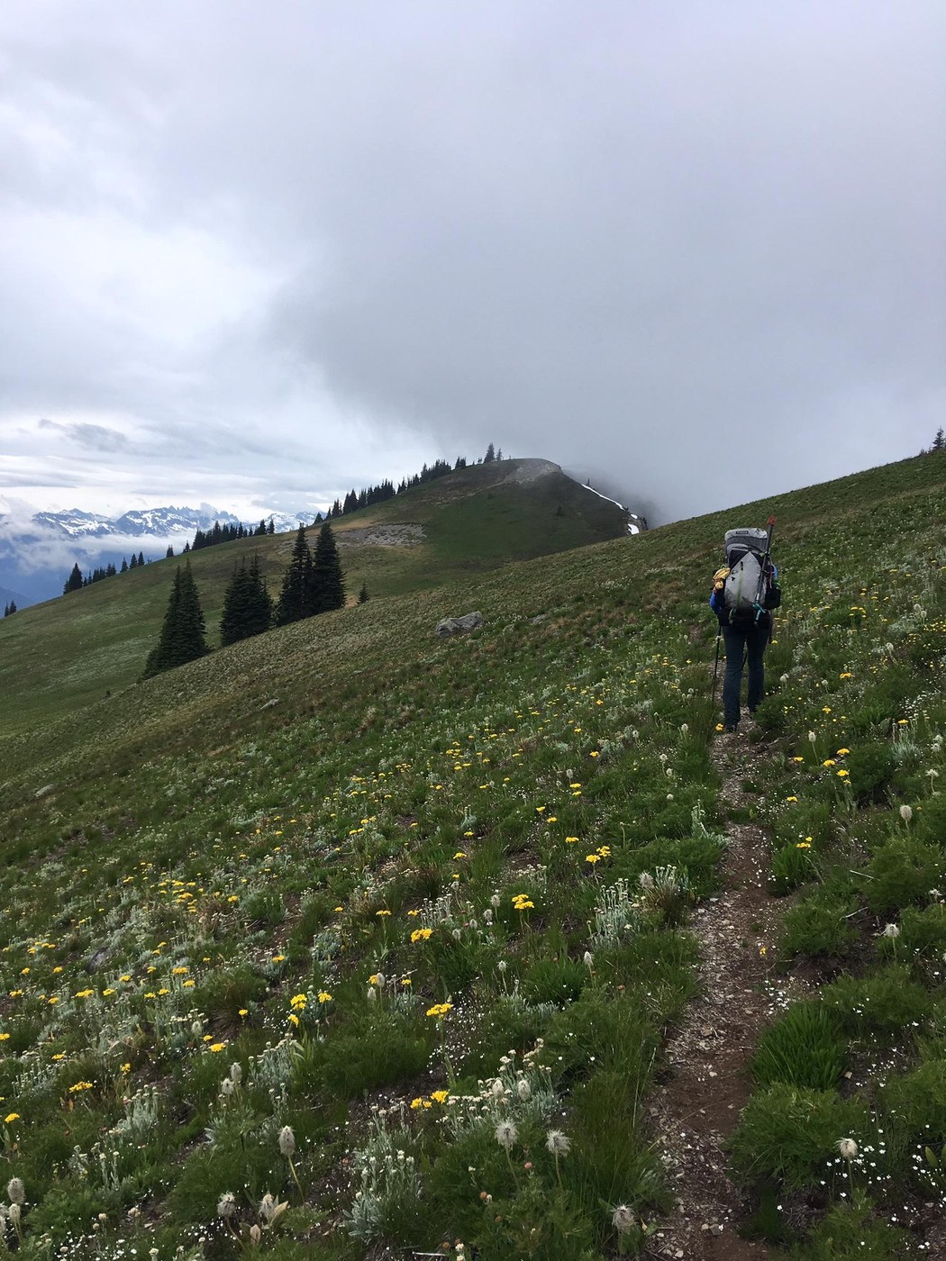 The two of us spent 6-days hiking the Canyon Creek variation of the Seven Pass loop, which means Sky Pilot, Holman, Woody, Hopkins, and Castle passes plus the gorgeous and challenging Big Face Basin, ~75 miles total. If you like walking the ridges, this trip is worth your time. We started and ended at the Canyon Creek Trailhead on Hwy 20. Note: As of July 4th, 2019 both the Jackita Ridge and Canyon Creek trails were "officially" closed. Both were passable in spite of the closures. Read on for details and make your own decisions. The wildflowers were near peak in the alpine. Beyond a salt-curious deer on the East Bank trail, we did not see any significant wildlife, though we saw fresh bear scat every day. Aside from the few miles where our route hit the hiking superhighway that is the Pacific Crest Trail, we had the wilderness all to ourselves. We probably saw 150 hikers on the PCT and only 2 other people the other 60 miles of the trip. In terms of equipment, we were happy to have carried good sandals for the fords at Cascade, Holman, and Big Face Creeks. We also carried ice axes and crampons based on a previous trip to the Devils Dome area at this time of year, but they proved totally unnecessary the first week of July in 2019. I wish that I'd thought to use PCT Holman-Castle trip reports as a proxy for snow conditions on the Three Fools and Center Mountain ridges.