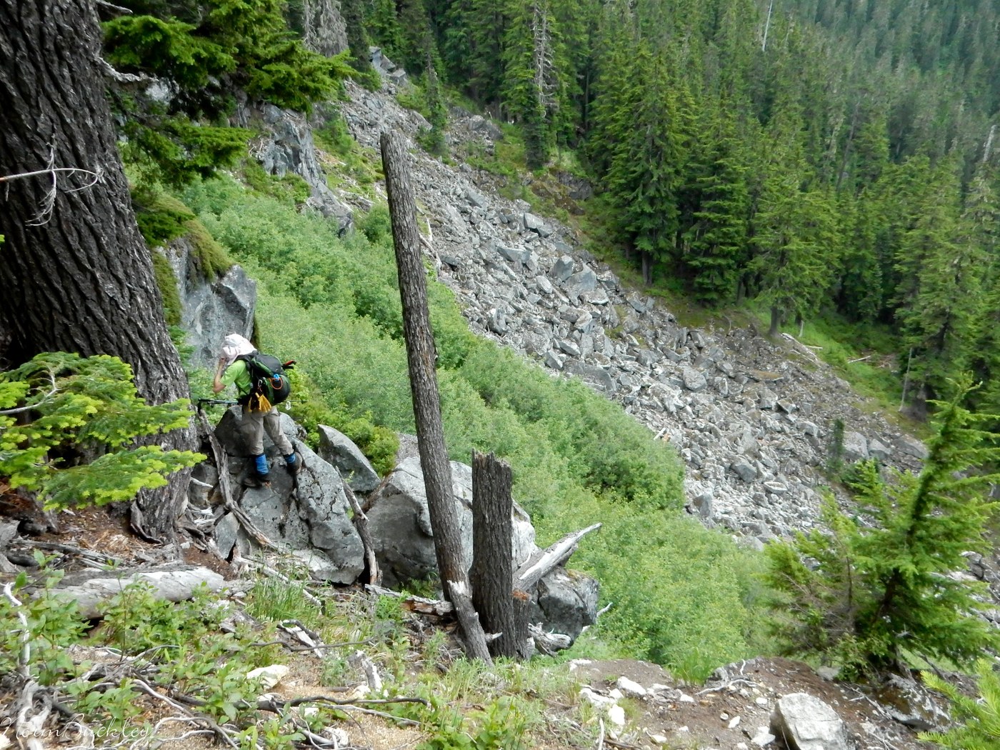 There were six seasoned hikers and two cars positioned at each end of our planned route. Two left at Martin Creek and two driven to the Johnson Ridge trailhead that starts at 3700' at roads end of FR 6520. Roads at both ends are in better shape than many others. We got a very early start for this complex trip. So after getting vehicles placed we started up Johnson Ridge at 0730, crossing Sunrise Mountain and stopping briefly on Scorpion's flat summit. Then, after taking in the spectacular view north and south, we headed down passing the Joan Lake trail junction looking for remnants of the trail that connects to the seemingly abandoned Kelley Creek trail. We found blazes on trees and cut logs to follow but no trail. We continued slowly southward, crossing steep slopes, fighting thick brush, traversing a large boulder field until finally sighting trail remnants and some cut logs about 50' above us (4580'). This was about two miles from Scorpion Mountain. It was hot, the mosquitos were thick and we were tired of this off-trail exercise. We were all so glad to have finally found an easier passage down on the old Kelley Creek trail and its intersection with the new section that continues down from the large log crossing over Kelley Creek at 3500'. From there it was an easy hike 2.3 miles out to the Martin Creek trailhead; hiking down the trail where we had spent two days clearing logs the previous week.
