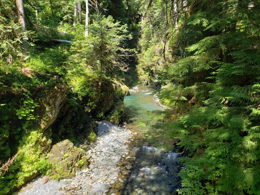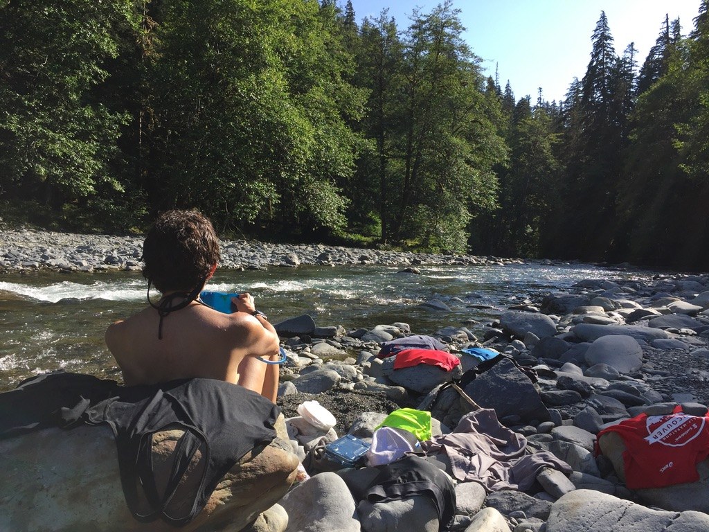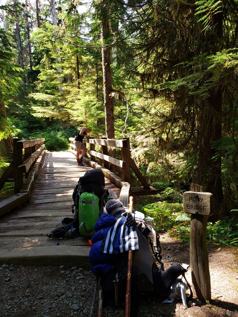 Day 3 - Fri Jul 19th: Excited (and scared - myself - due to Craig Romano's note of this being "bear abundant area") we hit the trail. We went easy. The goal of our trip was to enjoy nature and the journey, to reflect on Diego's life and our lives now without him. The goal was not to beat a determined pace, or get to a determined point or at a determined time. Going mostly uphill and with eyes wide opened to the new experience we arrived to Pony Bridge and decided to camp there. There were tons of bugs, but our natural repellent was amazingly good (REPEL Plant-based lemon-eucalyptus): No bites, and we are both those who always get huge hives.... The campsites were empty. We walked around to scout the area, went down to the creek, found a place for our bear canister, determined our "bathroom zone", enjoyed our surroundings and happily claimed our first night in the forest. Temperature went down to chilly 39F. Food: Breakfast: Oatmeal on Quinault Lake - Lunch/Dinner: leftovers from day before.