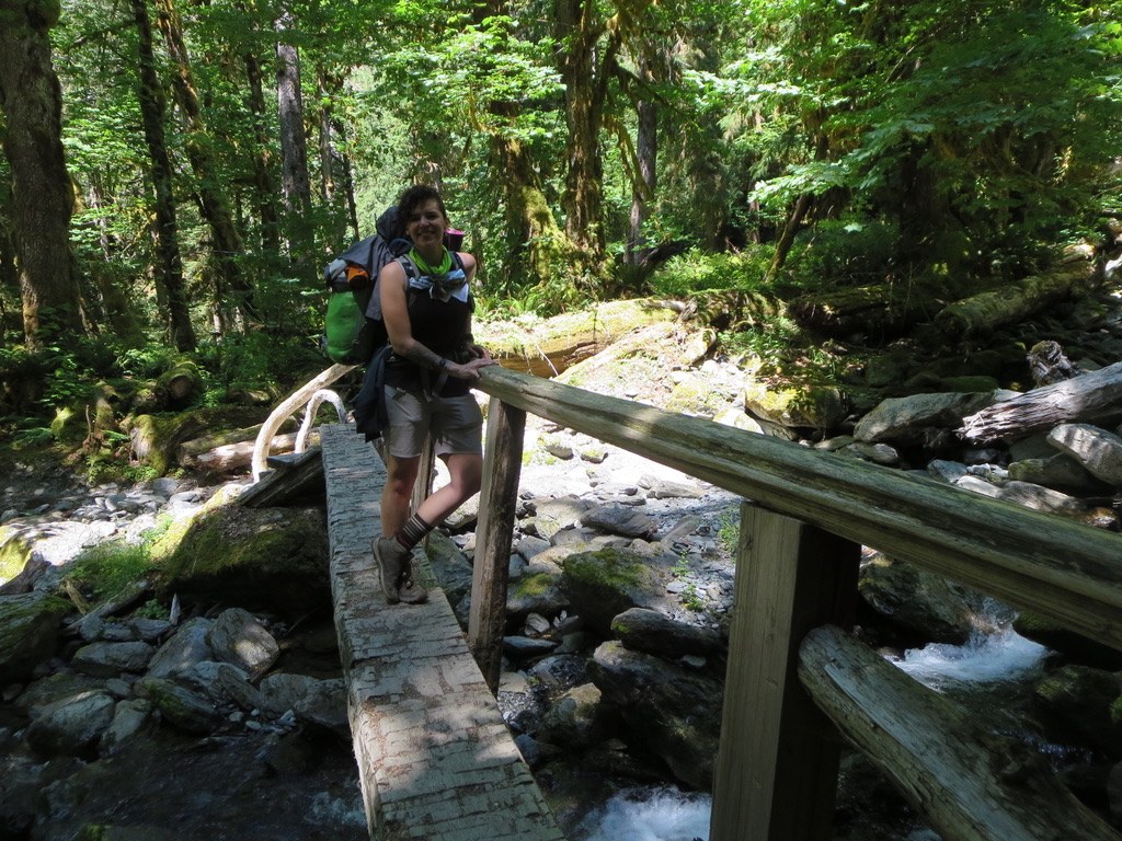 Day 6 - Jul 22nd: The first anniversary. The heavy weight. The unbearable pain... but our souls were lighter. Lighter than the whole year. The whole backpacking trip had made its miracle. It had lifted our spirits, not sure if temporarily, but now we know where to find the solace we need. Our journey back to our car (6.7 miles) was easier. We stopped a lot, to clean and carve a walking stick, to eat, to rest at a river bed as daughter felt dizzy, to reassemble her backpack, to pick me up after a fall...with all that, we did good. When we saw a beautiful pool that a couple of hikers have shown us on our way up, we knew we were close. Minutes later, there it was: Pony Bridge. Only 2.5 miles left. We stopped to admire the color of the waters of the East Fork Quinault River. Read some names carved in the wooden bridge... and paused to carve Diego's initials. The rest of the journey back to our car was easy, easy. When we saw the parking lot we ran towards the car... we have made it.