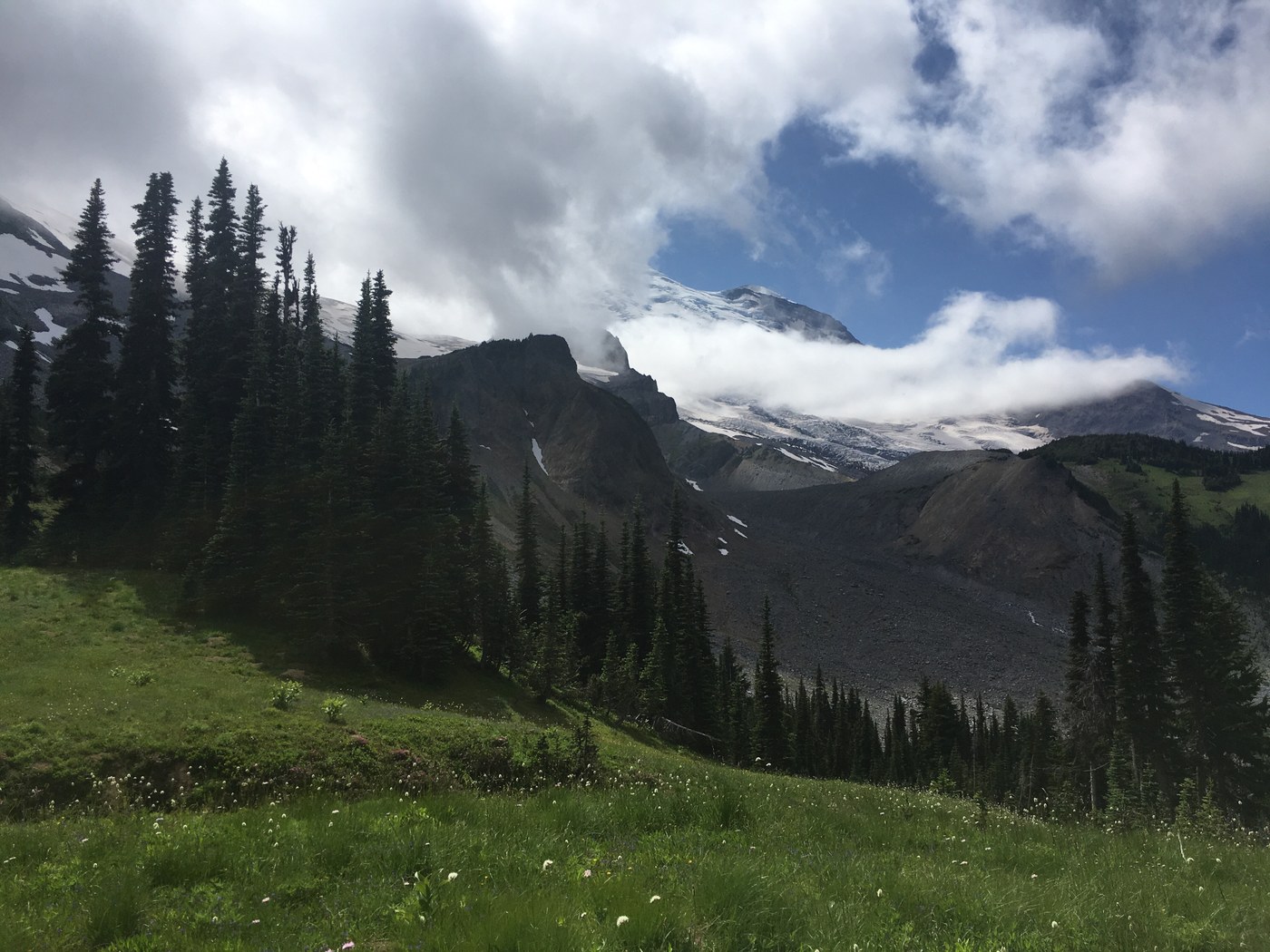 Weather was partly cloudy up to Summerland. Meany Crest up to Panhandle Gap was in the clouds. ^_^