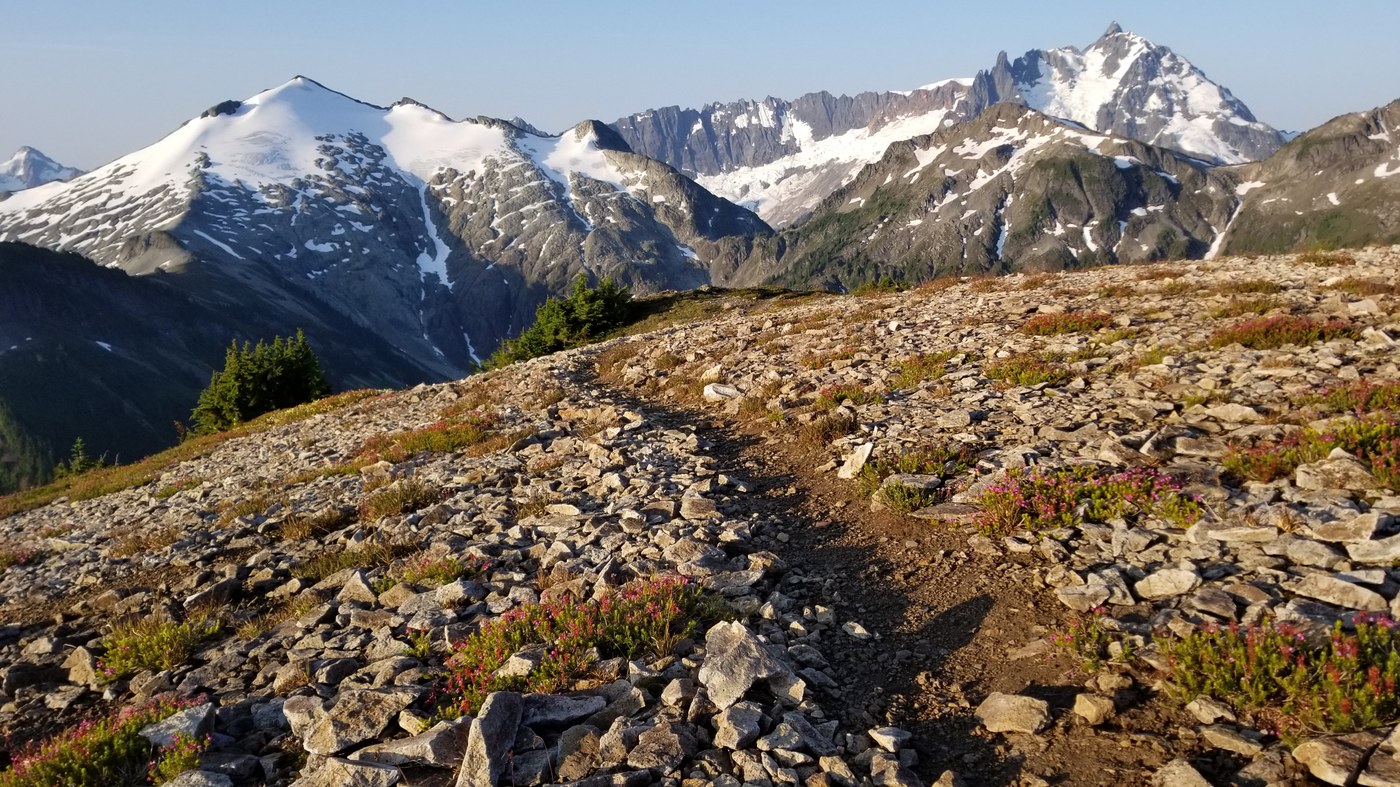Our plan for the day was to complete the Copper Ridge Loop in one long day, and leave some room for a potential detour or two. In our case, our detour was the trail up to Hannegan Peak. The first few miles required our headlamps, but we could see the sun slowly illuminating the peaks to our right. Once reaching the pass, we got an incredible view of Ruth Mountain as the sun was coming up. Since it was approaching golden hour, we opted to take the 1 mile trail up to Hannegan Peak. We were rewarded with incredible panoramic views of Ruth Mountain, Shuksan, Baker, and the many peaks that would be more clearly viewed later in the day.