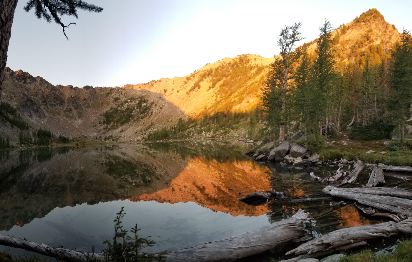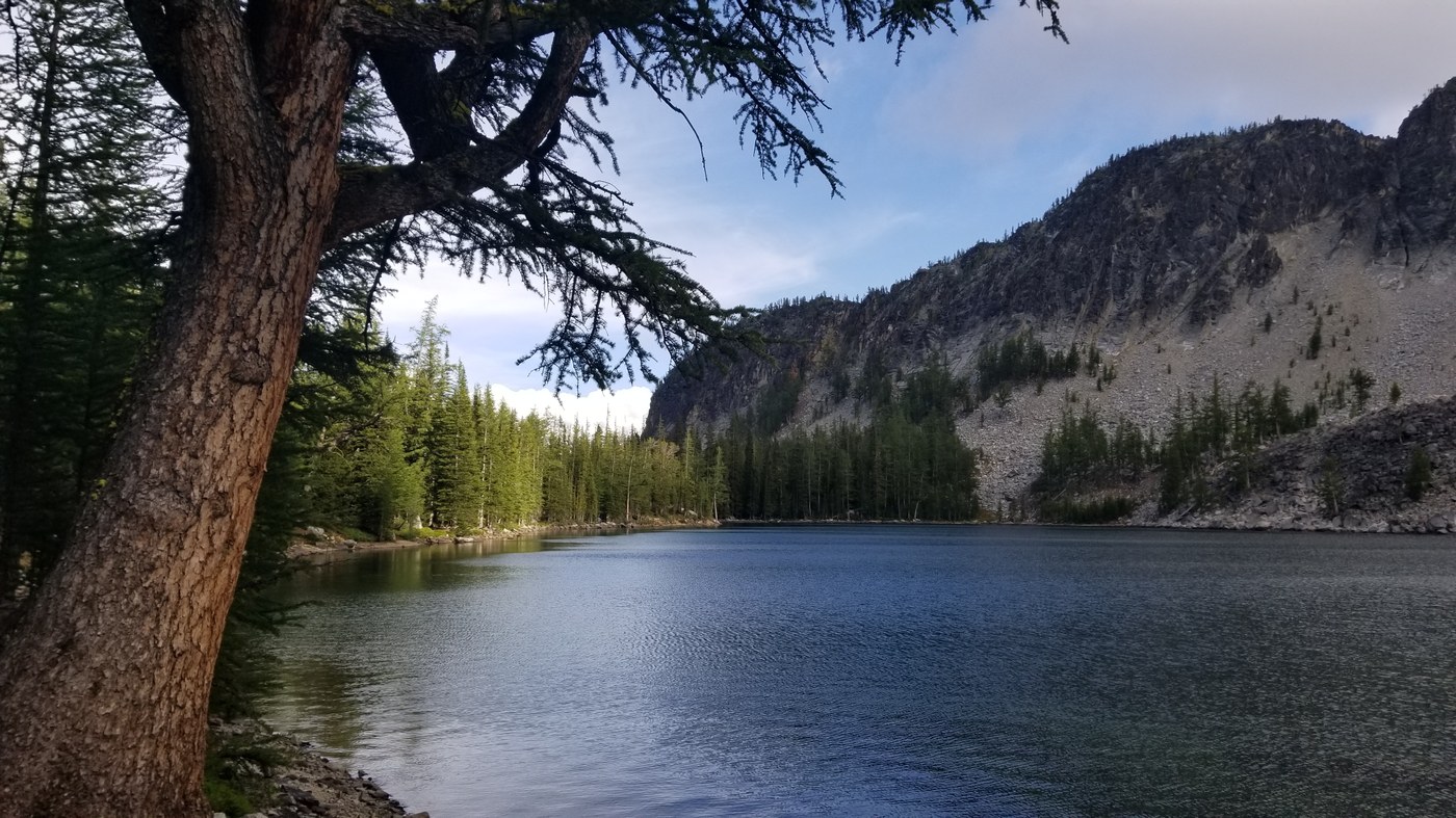 After postponing for a couple of days due to a red flag warning, our group of 5 Mountaineers set out on Sunday morning on an exploratory backpack around the Sawtooth Lakes. Google maps took us unerringly to the trailhead and the road was in great shape. Huge parking area with nice restroom. Five other cars there. The trail is to the left of the parking area, signed Martin Creek. The trail climbs a gradual grade through mixed conifer, mostly forested with a few open sections that can get somewhat rocky but generally excellent trail bed throughout, and good signage all through here. At about 5 miles there's a lovely viewpoint out over Lower Eagle Lake to the Columbia basin, and a heartbreaking little memorial to two beloved dogs along with a couple of rock benches. As you approach Upper Eagle Lake there begins to appear amazing lush green meadows filled with wildflowers, as well as thick stands of larch - some of which are huge! Upper Eagle has a good sized horse camp and 4-5 more tent sites a bit further along, and a few more solitary sites up and down the lakeshore. There's a pit toilet with a box just up the hill out of sight. We had a lovely night there though there was some wind and it was chilly.