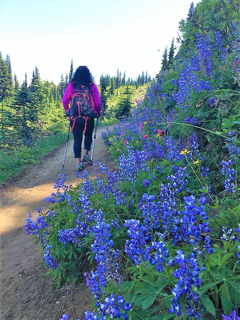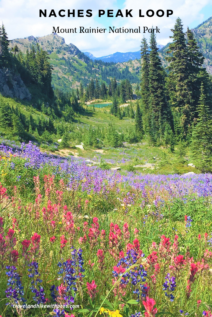 We hiked the Naches Peak Loop on a sunny weekday. Was surprised to see the parking lots full on a weekday but got parking spot easily. Wildflowers are in full bloom at Naches Peak Loop. Starting right from Wooden bridge over Chinook Pass on Pacific Crest trail, we got to see colorful wildflowers. The unnamed lake was very beautiful with clear waters and surrounding green vegetation. As we passed through the trails, there were sections bloomed with purple lupines, pink and orange paint brush and chamomiles. The feeling was like we were walking in kingdom of flowers.