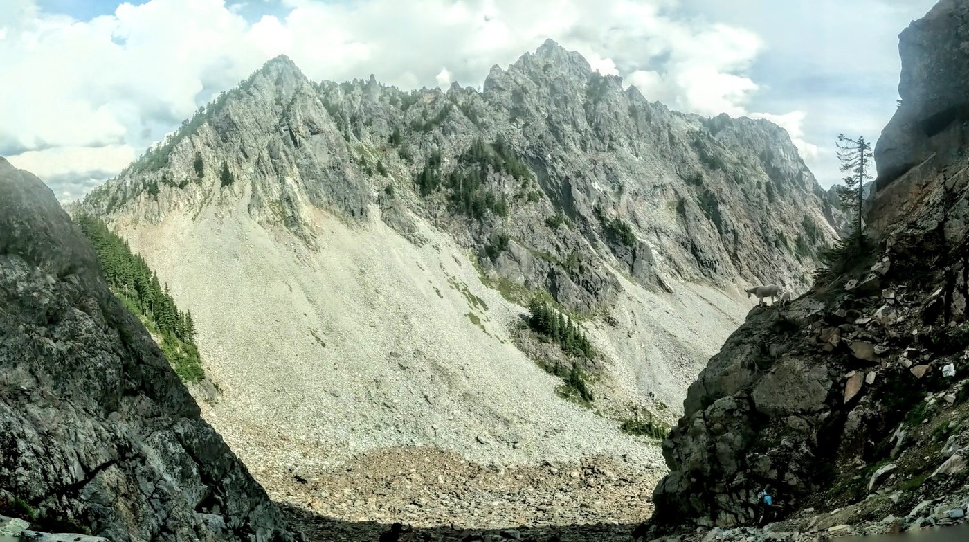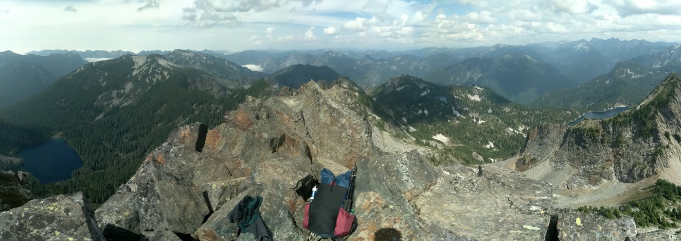 The Kaleetan climb was also a butt-kicker and I arrived at 1:45. Having camped at 1200’, finally topping out at 6200’ felt great, but the best was yet to come. Departing at 2:15, I took the gully. From the top, the gully looks worse than it is, and if you scope it out, you’ll see that it’s mostly just exposed class 3. Saw a family of mountain goats perched on a ledge! From there I skirted to Melakwa pass, down around the east side of Chair Peak Lake and up to the saddle at it’s outlet. After a stop there, I departed at 3:30. Don’t be tempted by the ripe blueberries and beautiful meadow below like I was – climb to the left. Uli’s TR covers this part perfectly: