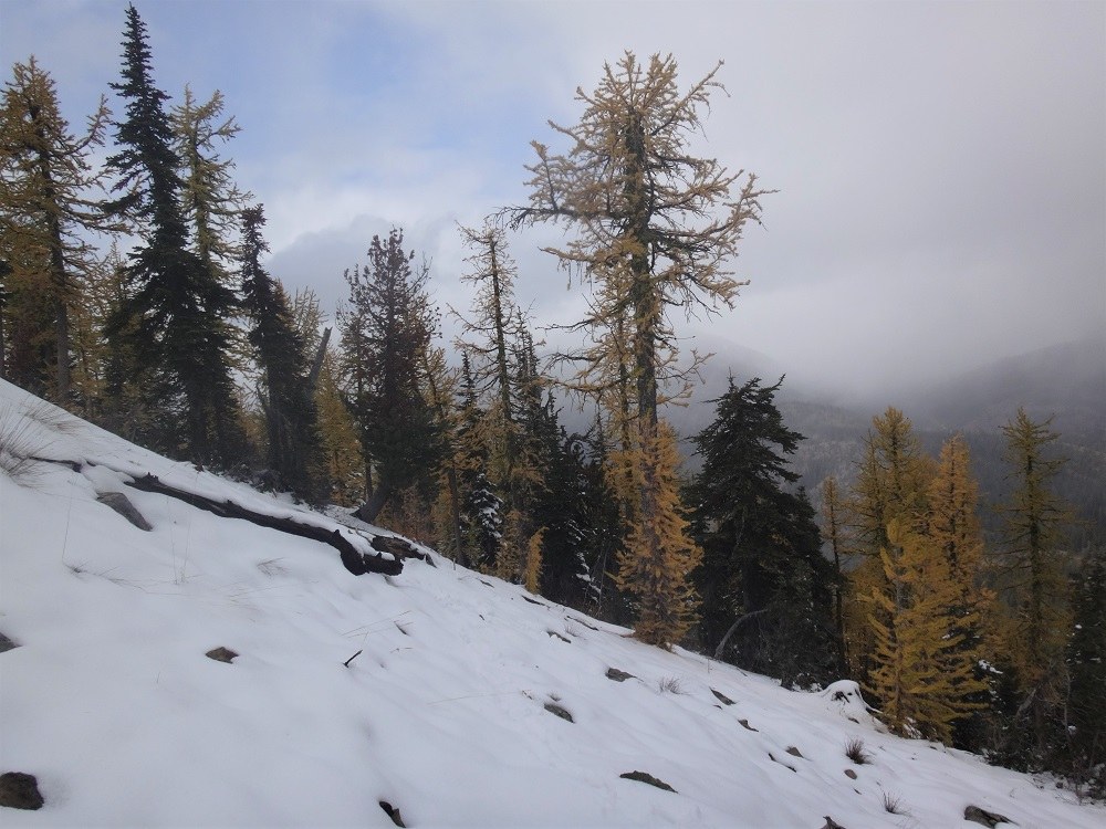 The hike itself is incredible, but we highly recommend either crampons or poles (or both) for the trip higher up. The path is already covered with slick snow and could be difficult with just boots. Dress warm and be prepared for some fantastic scenery (even on a heavily overcast day). The Larches are the stars of the journey, and we were lucky enough to see them in multiple lighting conditions as we made the trip.