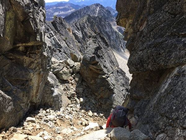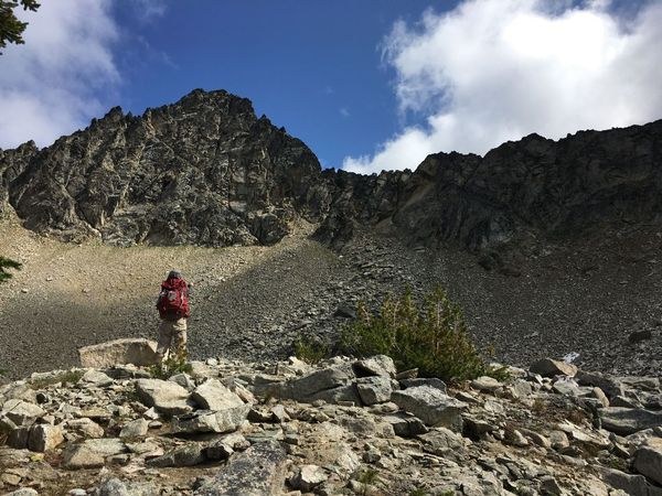 Day Four (8/12/19) –Sung and I got up at 3:00am and left Camp at 4:00am to climb Reynolds Peak. Our plan was to cover the main trail in the dark, then scramble up Reynolds Peak by daylight time. Just about 20 minutes from Juanita Camp, we reached War Creek Pass junction. After three days of backpacking, some of the details of Reynolds Peak route were fading away from my memory. We turned right at the junction and hiked down the valley for about an hour. While waiting for Sung to cross a big log with thick branches I looked at my GPS. Apparently the Biulder Creek Trail was way up and we were deep down in the valley. We hiked all the way back, worst of all, all uphill. By the time we reached Reynolds Camp, it was about 9:00am. From Reynolds Camp we were trying to find a booth path to Reynolds and saw none. I recalled one of the reports on WTA the author mentioned ‘following the creek’. We hiked past the creek about 100 yards and still did not see any booth path, so we decided to start at an open spot not too far from the creek. We tried to stay close to the creek while taking advantage of the ridge as bushes were thinner. After a short while, we reached a meadow and if I remember it correctly Camel Humps was partially in view. We felt good! We took a short break then proceeded further up where we saw a beautiful peak in the front of us and Camel Humps was on the right. We looked at our GPS and thought the peak in front of us was Reynolds Peak. We followed the creek (no water at the upper part) until we reached the boulder. From the distance, we saw two potential routes - climb up on the far right and traverse back along the ridge or follow the gully. We decided to check out the gully first. We started climbing up the gully. It was extremely difficult to climb up, no stable foot and hand holds. Near the end of the narrow gully, I was struggling to make my last move to safety. I pressed my left knee hard against the dirt covered rock and somehow pulled myself up. Then Sung’s turn, no difference; but she somehow made it to safety. I didn’t clarify with Sung, but we were apparently at a smaller and shorter gully. The one we saw from the distance was the bigger and longer one in the front of us. We decided to climb down to that big and long gully. It was less steep and climbing up was pretty easy. We took a short break then climbed up quite a bit on stable rocks. It got steeper and we started to wonder if it was class 3. We didn’t have helmets. We also got confused if it was Reynolds. My Gaia Topo map showed Reynolds was to the north at 8300 ft.; and my Gaia USGS Topo showed two Reynolds Peaks and this one was at 8500 ft. It was already 4-ish in the afternoon. We were about 100-150 ft. from the summit. We decided to climb down. Back down to boulder, we looked at our GPS map again. At this point we thought the peak was not Reynolds. We decided to follow the route that I had plotted. We climbed up the ridge to the left of the peak and saw another peak. We said huh here it is… We summited the peak. It was mostly class 2; the last portion to the summit was about class 3-. The view was very good, especially looking at the peak that we had just climbed.