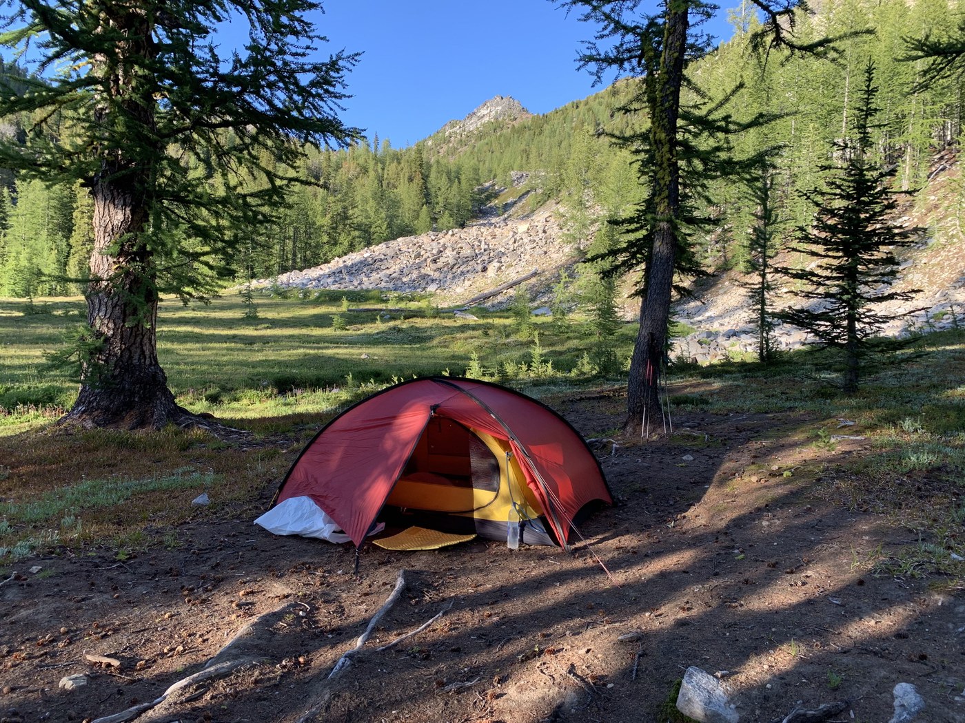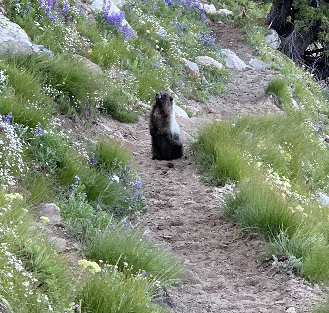 Day 1, Two friends, Nick & Julia from Connecticut joined us for this remote trip. A third friend, Jamie who had scouted this trail from the road to the ridge earlier in the summer drove us to the “trailhead” on the Foggy Dew Creek Road. (Coordinates: 48.19050358862389, -120.23466192453884). It was 11am. The Gold Creek branch off the Methow River Road was paved while the dirt Foggy Road was in good condition. The “trailhead” location was at elevation 3000 feet at the last switchback in the road, it was not at the end of the road where the Foggy Dew River Trail starts. There was not signage. Nick and Julia mentioned that training in Connecticut topped out below 3000 ft. The “trail” began as an old road, but quickly transitioned to a stiff trail reaching the ridge at 4600 feet. We were all working hard on this dry slope. The views were great as we now followed the ridge upward to nearly 7000 feet. The trail deteriorated due to lack of foot traffic, but the open ridge was easy to follow through beargrass. Our original plan was to have lunch at Cooney Lake! This was not going to happen, I was whooped and the ridge continued on and on. Finally the route dropped onto the south side of Foggy Dew Ridge and into a marshy basin with plentiful water at 6900 ft. After a long rest drinking lots of cool water it was decided Cooney Lake would be today’s goal. Eventually we got going and traversed thru a 6900 foot saddle and side hilled NW to meet a valley trail about a mile below beautiful Cooney Lake. We hadn’t seen anyone since leaving the car and had Cooney Lake to ourselves. Surprisingly the bugs weren’t bad. We were tired after the 8.5 mile and 4800 ft elevation gain day.