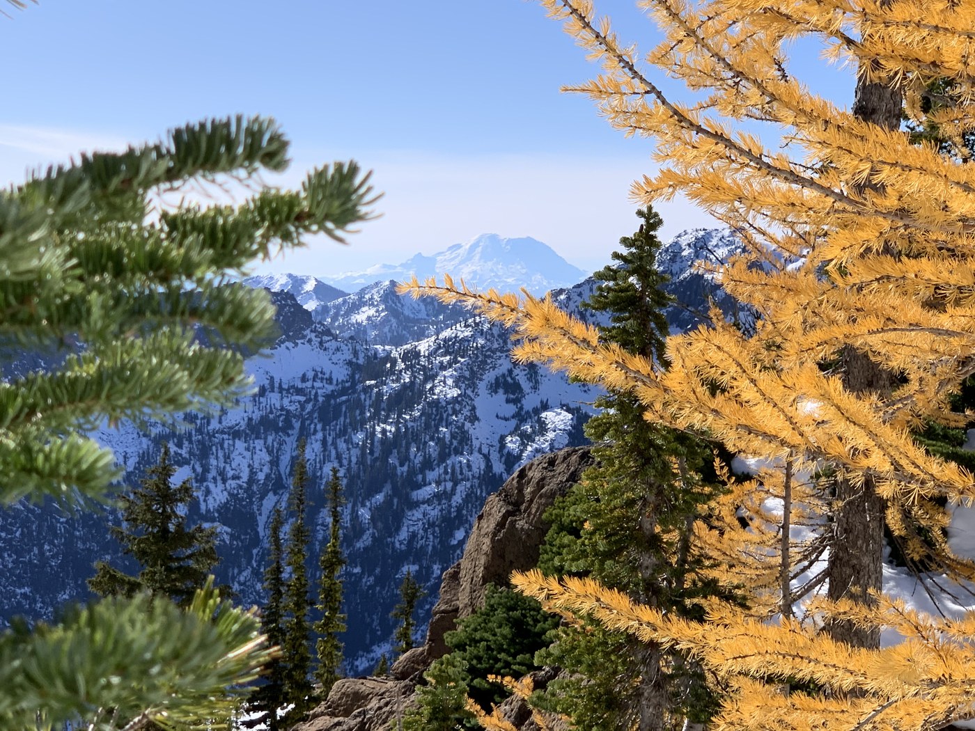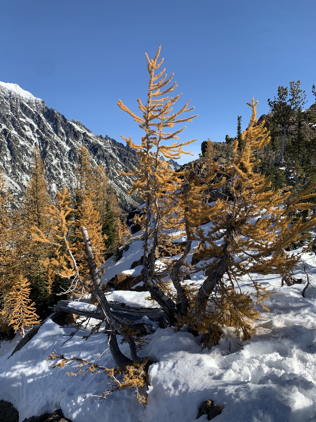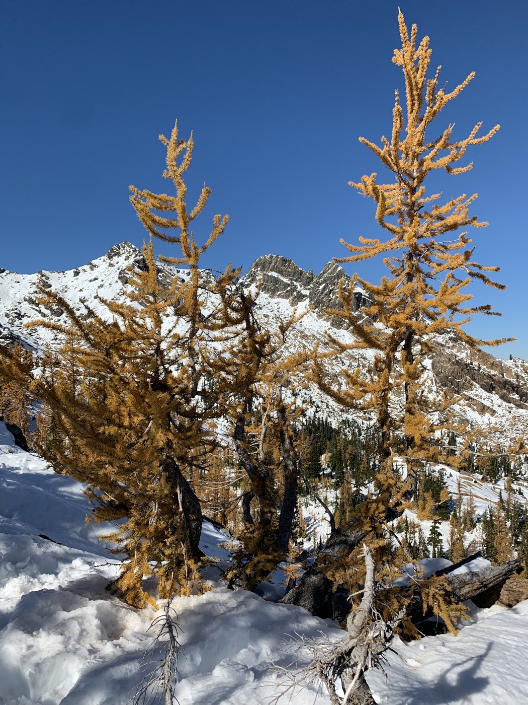This trip checked every box today: perfect weather, breathtaking mountain scenery, good workout, larches! There are many potholes on the road, but they were avoidable in my little hatchback. The trail is snowy, but melted quite a bit by the trip down. I did not need spikes, but boots are a good idea. I stopped at the gorgeous pass after a tall guy told me there was snow to his hips hiking down to the lake. The larches are wonderful at the pass, so it really is a great hike just the 6 mile RT to there. If you are in search of larches, I would go in the next few days, as we have a weather window, and they are just past peak now.