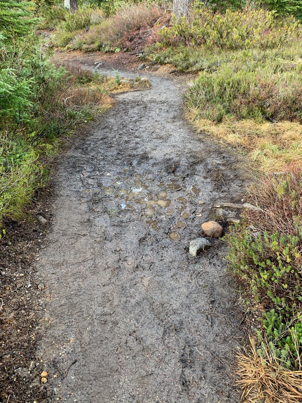 The flat trail through Schrieber's Meadow is very muddy. Fall colors, berries, and mushrooms are over, but the decaying vegetation against the evergreens still makes for a beautiful sight. There's a small wooden "bridge" (see picture below) over the Rocky Creek, where you then turn right then switchback left up through the boulders to stay on the trail. The trail remained snow free and in excellent condition until after the second junction with the Scott Paul Trail (~4400 ft) where there was a slush/frozen mud mix on sections on the trail from here to the Railroad Grade trail junction. Mt. Baker was visible in all it's snowy glory through this portion of the trail as we headed toward the Bell Pass Junction. Those boggy meadows had water running through sections of the snow with the trail a slushy/muddy mix. There was also a number of bugs/mosquitos flying around us during this section and above at the tarns...in November? Once the trail starts to ascend on the other side with the boulder fields full of pikas, then snow cover begins in earnest where we put on our microspikes.