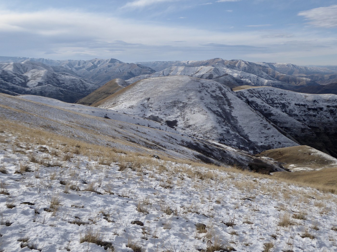 Lower down there is no trail but the terrain is wide open (though may be a bit brushy in summer) and I gained the ridge at a low spot past the cliffy areas. Game trails and old, grassy roads make the going up easy and I mainly hiked up on the crest of the ridge beside an old fence line until just below the summit.