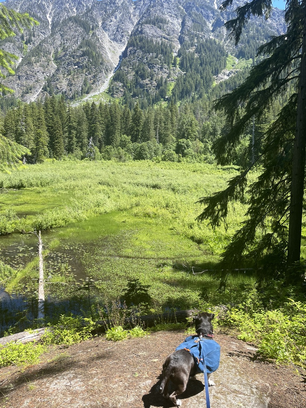 Long version: Wednesday around noon, hit trailhead on a gorgeous day. Two of us and a small (but feisty) dog. Trailhead only had one other car, and there was still plenty of parking. Bring bug spray, the bugs weren’t afraid to show themselves today. Biggest challenge was navigating the river crossings with the small dog who isn’t a great swimmer. Required use of the downloaded map multiple times during the water crossings. There are some places to shimmy across logs, but you can also just get one deep in water if you prefer (but the current was too strong for us today). The trail followed the river from here, going uphill to a small swamp smelling area. Pushing past the foliage, there is a lovely lake. Vegetation is very overgrown but there are a few spots around to take a rest. Hard to reach the water though. Trail becomes even more overgrown going up to second lake, so we skipped it. Way back was a breeze, stop at the fork near the trailhead to a quick vista.