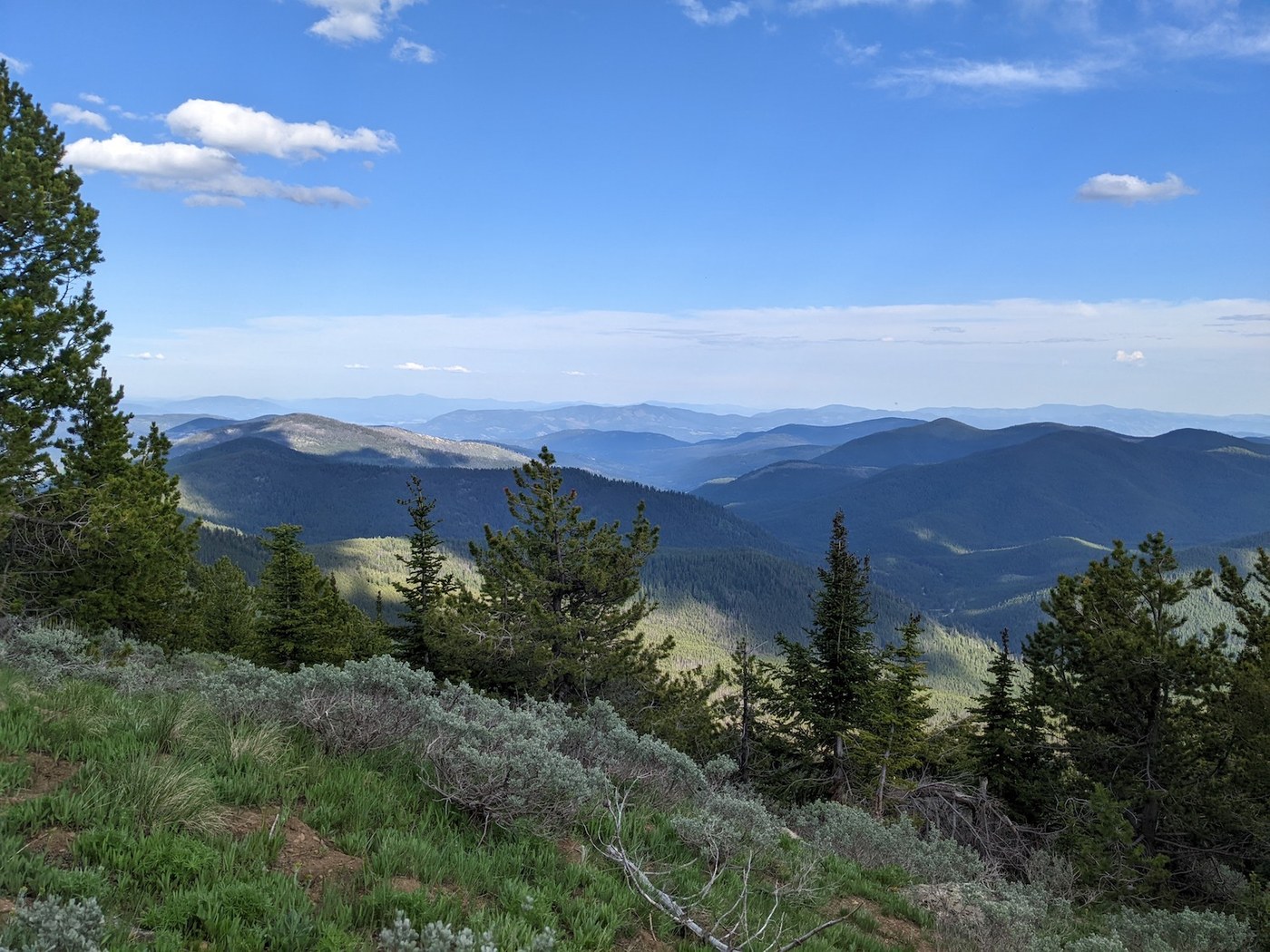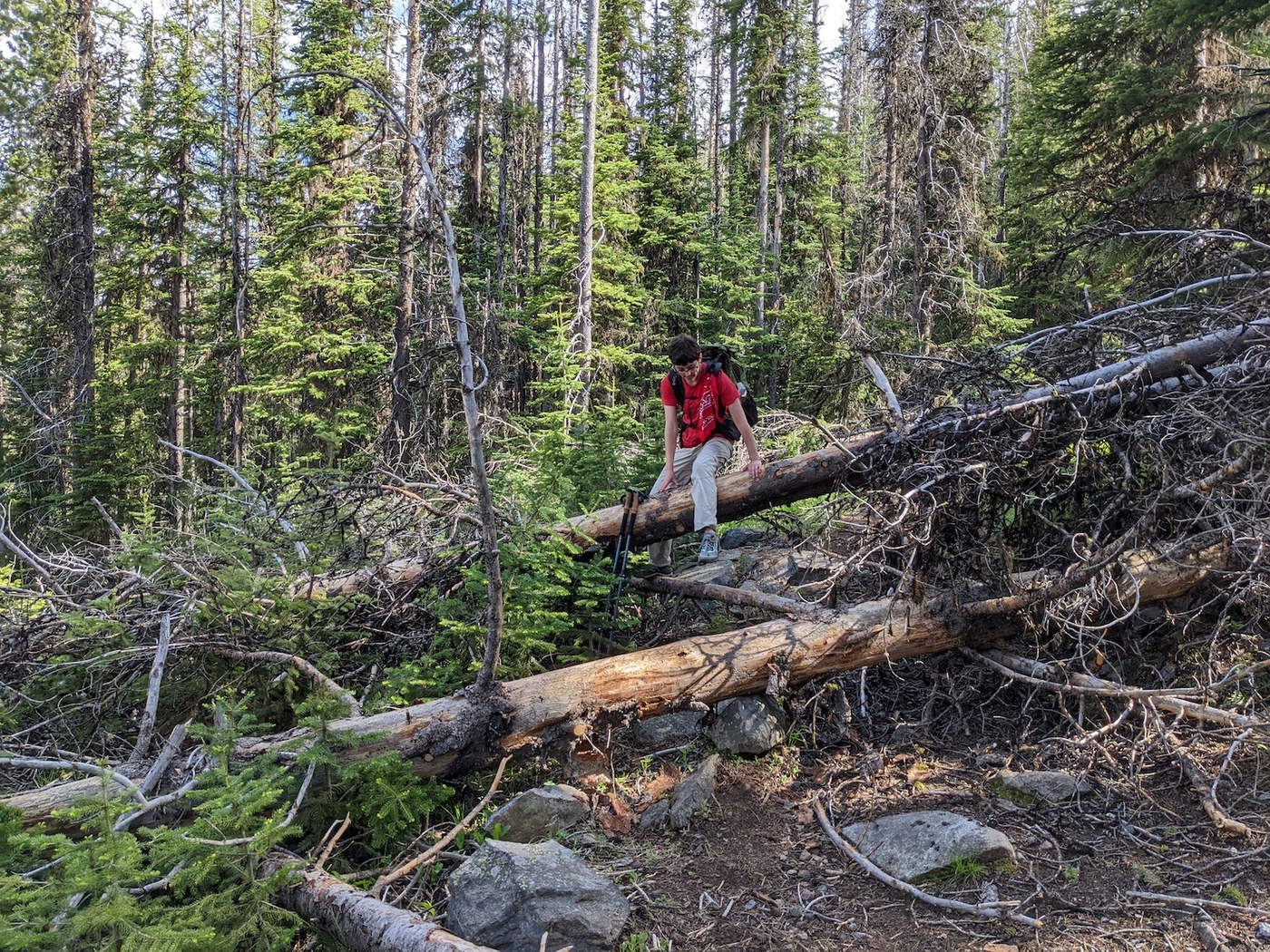 We went for an overnight backpacking trip on Kettle Crest North #13 to the intersection with Jungle Hill trail, where we camped. The trail was snow free with just a tiny bit of minor mud. There were approximately 100 downed trees on trail. We counted, but may be off by 5 or so. Most of the trees were step-overs. Some needed to be walked around or navigated over. There were many long stretches that were clear as well. Flowers were prolific, as were black flies and occasional mosquitoes. The trail was beautiful. This was the first time I had been past the junction to the Columbia Mountain loop. The switchbacks down and up through the Jungle Hill area were lovely and well-graded. After dinner, we walked further up trail, where we could see mountains upon mountains. A fun and beautiful adventure.