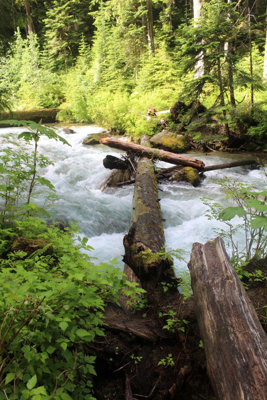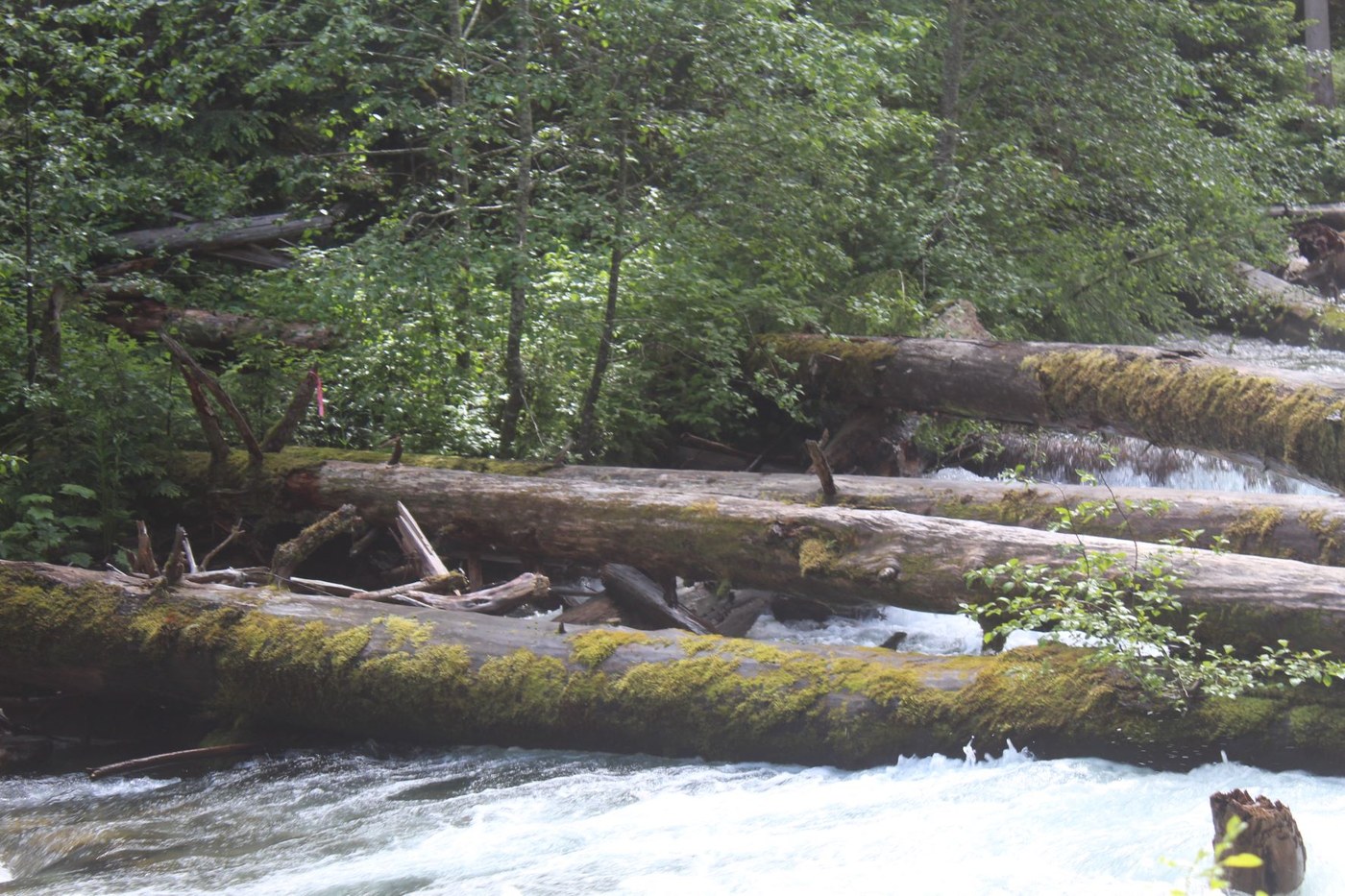 At the trail junction I turned right and traveled south a short distance to the log crossing over the N. Fork Sauk River. The snow melt was so high the normal log crossing had water 1/3 of the way up the log. Since one would have to butt scoot across the wet log, I didn't want to get my feet wet, so I went upstream and crossed the river on a jumble of logs that were higher above the water.