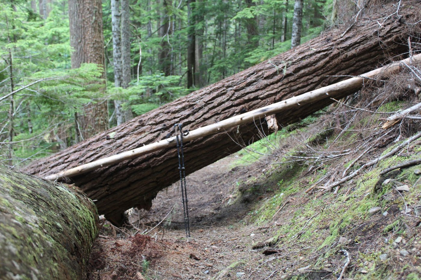 I hiked up the Pilot Ridge trail for two and a half hours, doing light trail clearing work along the way, at which point I turned around. There is one 4 foot diameter log across the trail that needs attention some day (see photo), but one can crawl underneath it for now.