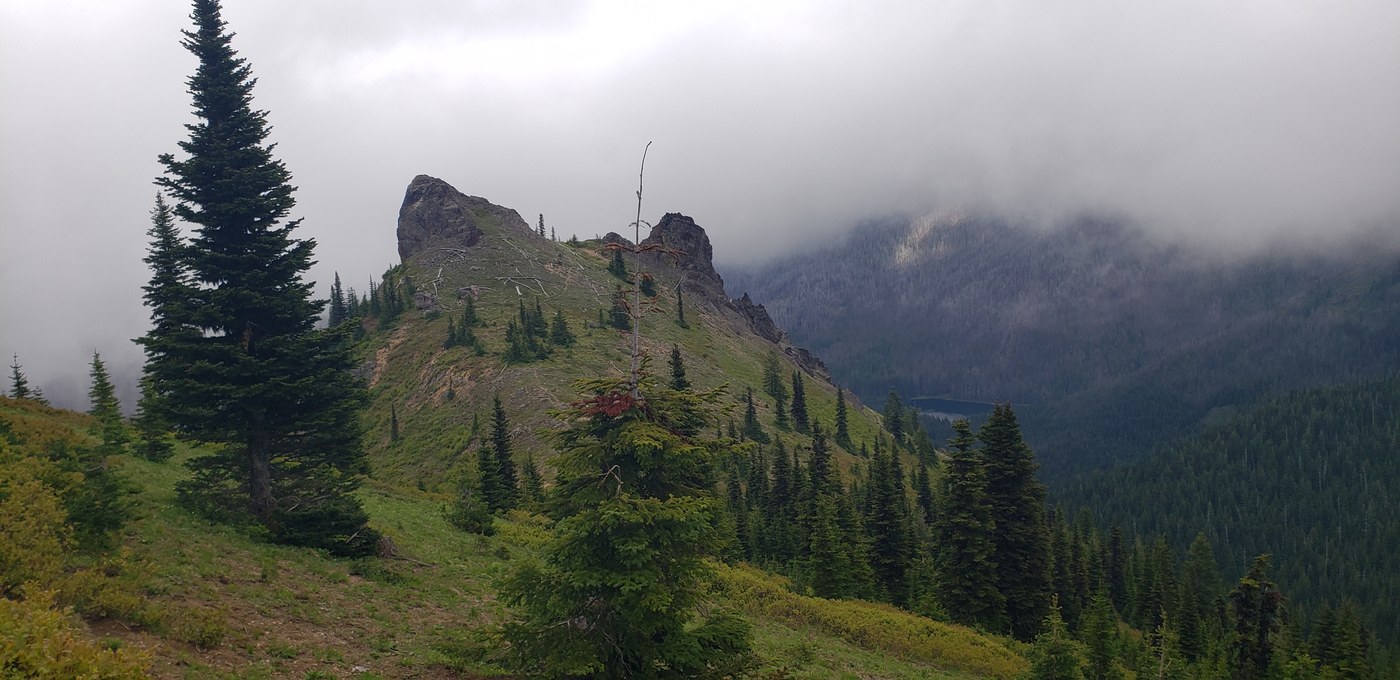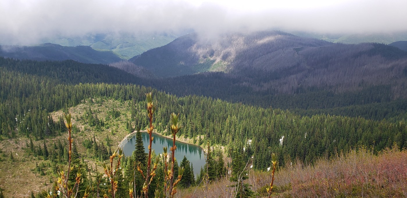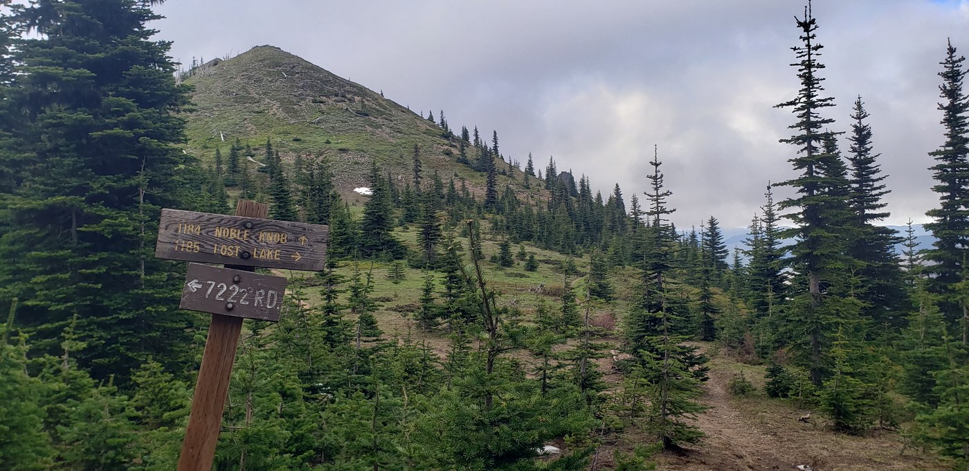 Parked along 410 around 1145 and headed up the Ranger Creek Trail. All the blowdowns had been cleared, especially after the Little Ranger Peak viewpoint. We continued for about 4.5 miles before reaching the split with Palisades trail. We stayed to the right where you enter into a completely different environment. Lots of burnt forest. Lots of green growing up around the old trees. In less than a mile you will see another split with the Dalles Ridge trail. We stayed to the right for another 1.25 miles until we reached the fork with Lost lake trail to the right and Noble knob to the left. We stayed in the middle and the peak is about .75 miles up. We did encounter a few patches of snow but easy to walk over or around. Peak is around 6,000 feet and snow free. View was still incredible even with some heavy clouds. You could see George Lake and Lost lake in the distance. Looks like you can drive within a few miles of Noble Knob instead of the route we went, but why when you can enjoy all of nature.