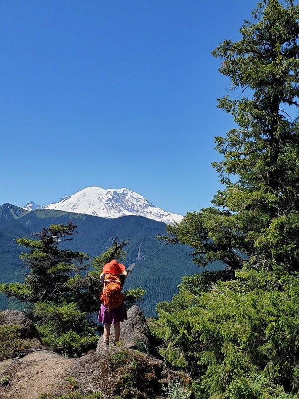 Our vehicle at the Ranger Creek TH was parked in the Skookum Flats TH lot, but there's also parking off the shoulder on Hwy 410. The tread and grade going up the Ranger Creek trail is easy on the feet and legs with few rocks/roots; except for the last quarter-mile or so of the trail right before the junction with the Palisades trail. Here the switchbacks have apparently been washed out and/or grounded out by mountain bike tires leaving these steep turns slippery due to the loose gravel and minimal purchase for boots. Other than that small section, the entire route was great tread and easy to follow. We didn't encounter any other hikers until reaching the last ~1.5 miles of the trip.