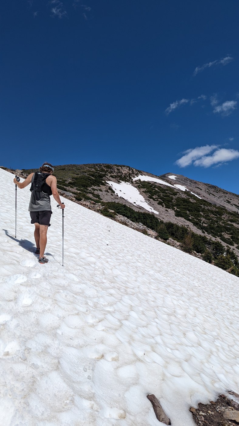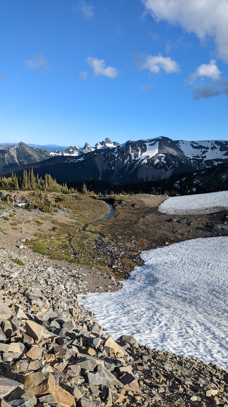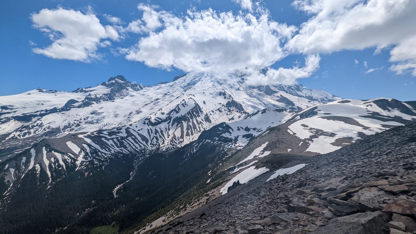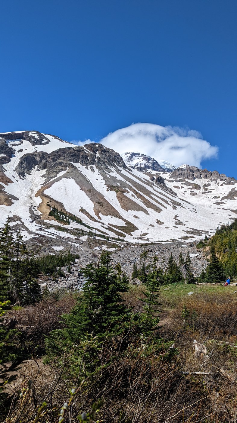 Trail to Glacier Basin is basically snow free. Lovely trail, saw a bear right before the basin. Cute and unbothered by us. Saw a decent number of people, including some climber groups headed up to summit.