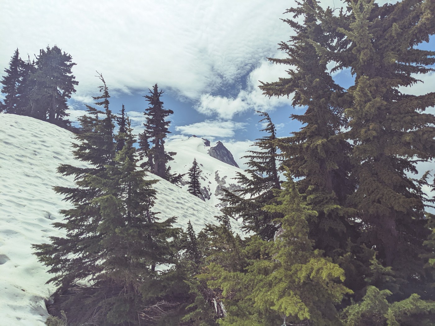 Made the mistake of going up the summit directly, via the super steep snow slope, and I made it, but white-knuckled it in the softening snow the whole time.