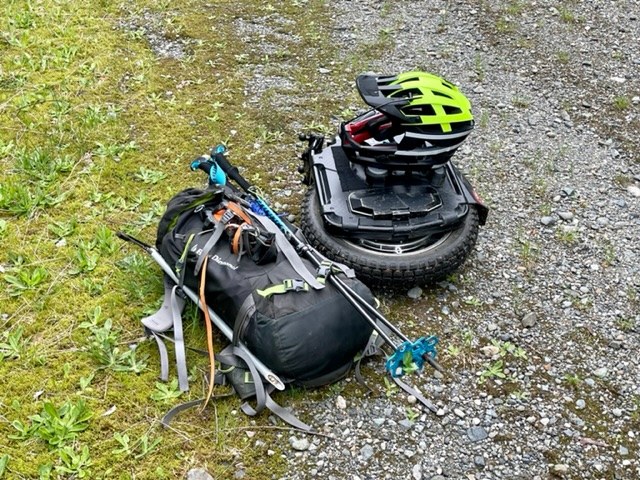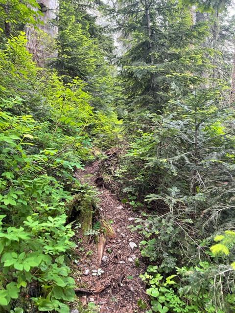 Decided to get up early and scout out the road/trail to summit of Three Fingers for later season attempt. Road from Mtn Loop to the washout was quite interesting with huge potholes making the drive very exciting. Also found many occupied shooting ranges along the route. I decided to bring my electric unicycle along to use as my approach vehicle as the distance from washout to trailhead is about 9.2 miles. This does require some balance but once you're dialed in you can travel at very high speeds up and down these mtn roads. I arrived at the trailhead in about 45 mins stopping enroute to enjoy the sites and sounds. The day was cloudy and my intentions were to just examine the trail a bit. After hiking about 2 miles (Almost to lake) i decided to turn back as routefinding on snowfield in fog was not part of my plan. Journey back was great fun as I flew 25mph down old road ducking from alder limbs as I went. Maybe this was the first EUC (electric unicycle) approach to this MTN. who knows :) Others on trail talked about snow being constant about Saddle Lake and route gets very dicey above Tin Can Gap.