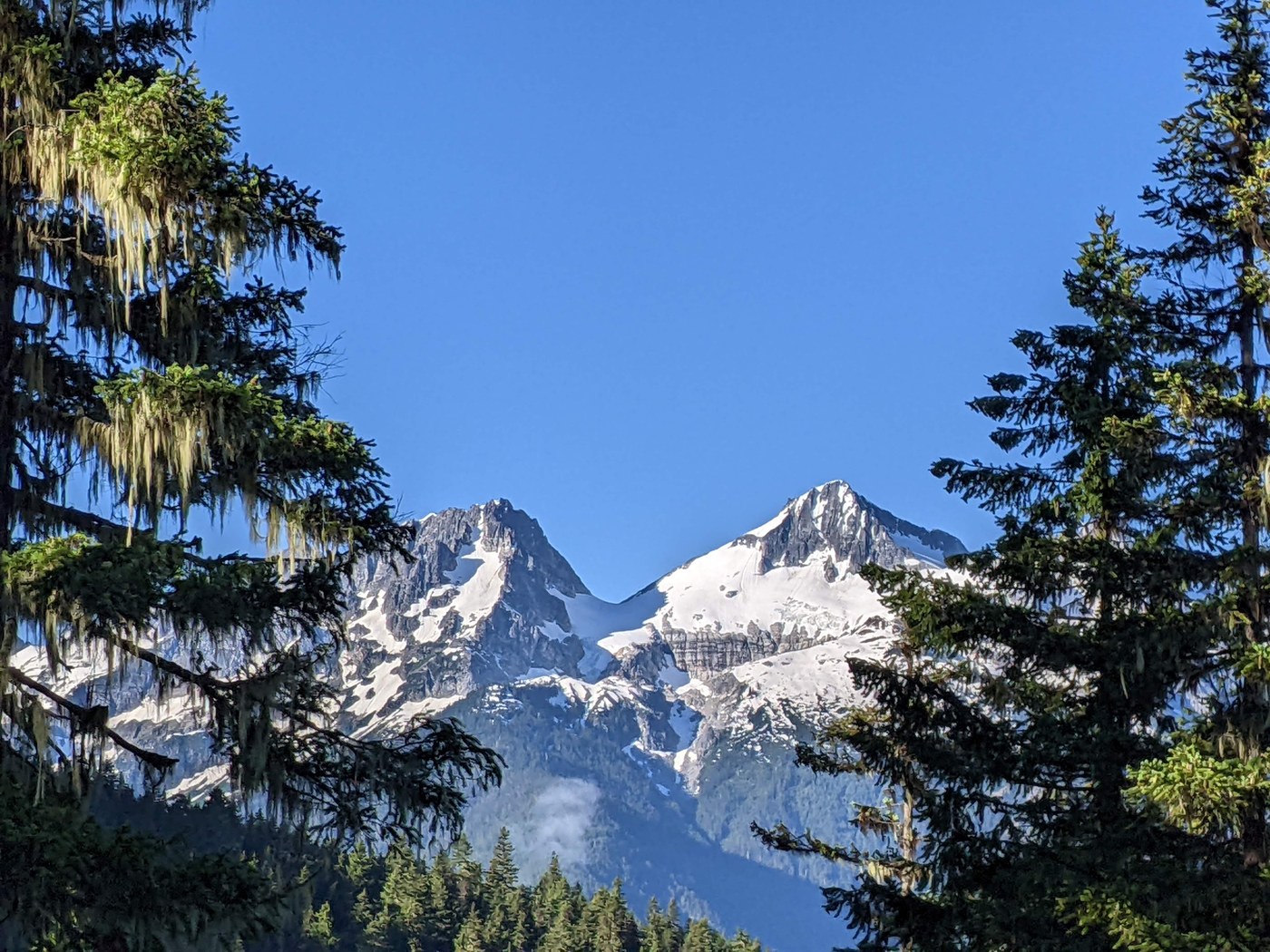 Beautiful hike up in verdant forest. Linnea was in full bloom. The switch backs were steep and short but tempered by the soft, duff trail. Just a few bugs. The trail is wide and well groomed. Several creek crossings available for refreshment. Enormous fir trees lower down will strain your neck with fabulous views. Mesmerizing glacier views from Fourth of July Camp. Water close by camp and a secluded forest box toilet on the uphill side of the trail. Short flat hike to Fourth of July Pass was dreamy and another source of water. Good selection of trees for bear hang. Minor delays on Highway 20 towards Marblemount due to road works. Rangers at Marblemount were very helpful.