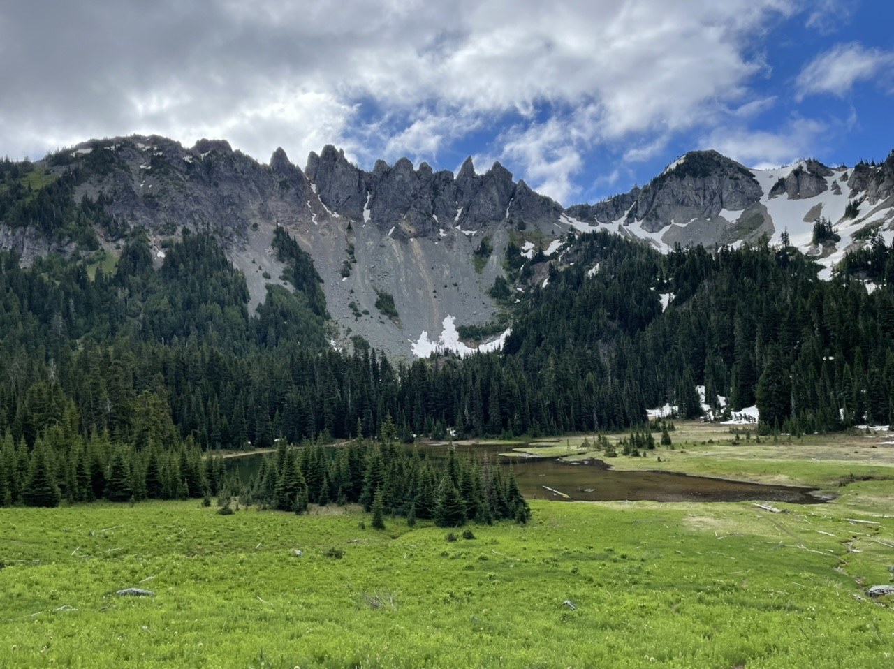 Camp has a couple snow patches on trail that are almost gone and campsites are clear with bear pole and toilet in. Highly recommend this trail/backpack if you have already seen some of the mountain and are looking for something a little less crowded and pretty chill/easy.