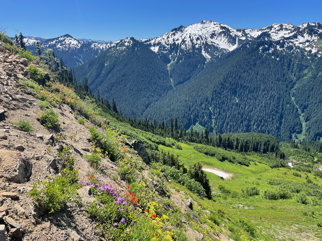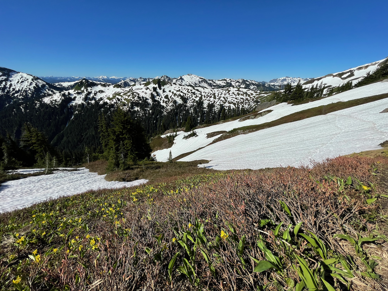 A lot of different varieties are wildflowers are blooming along the way, a ton of birds and marmots were active along the ridge, and the trail is snow free up to just after White Pass.
