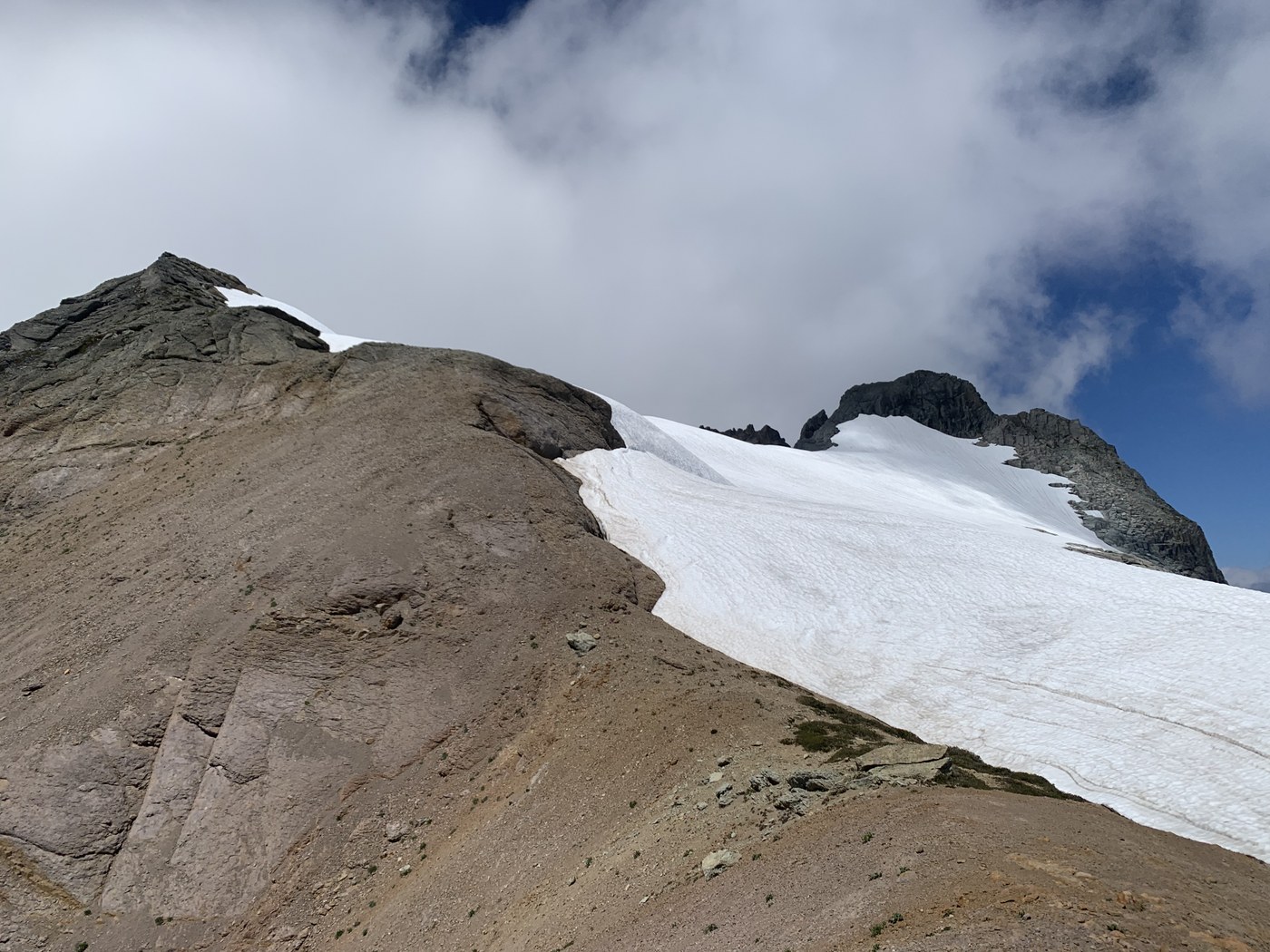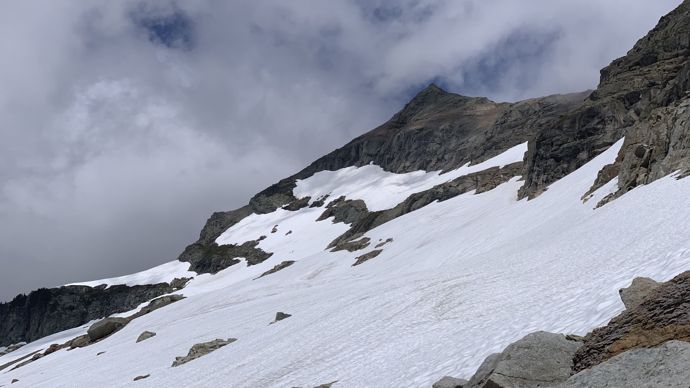 This is where whatever nice speed you were holding coming up will be diminished. There’s a not super obvious turn off, there’s a old tree post that’s mostly barkless which I guess is the symbol of a climbers path lol it’s just before you start to descend down to Blanca. I was going to check out Blanca but decided to pass as it was clouded in at the time. The boot path climbs steeply up the forested ridge. The path sometimes is very clear and obvious and other times non existent. I would recommend saving a GPS track on an app such as Gaia. Just turn on “public tracks”, locate one and save it to your app, it’s really easy and very helpful. Overall it was more followable than I expected. There will be a couple scrambles and steep trail spots. A moderate amount of bushwhacking. You mostly just follow the ridge largely on the right side for the first mile or so. Things get more interesting once you have to go around point 5,800. All the guides online suggested going left around it, so I did that and it was very unenjoyable lol. You drop down into a Boulder field and then head around the side of 5800 trying to stay mostly at the same elevation if possible. Back and forth of thick trees, slippery Heather bushes and slippery snowpack. Get ready to fall down a good number of times even if you’re careful. There wasn’t a clear path through here so I just made my way any way that looked safe and passable. Once around it you’ll climb steeply up the forested slope. Faint trail here helps a lot. Just take it up as far as you can go. Once you reach the top of the ridge you’ll hit the snowfields. I was really concerned about the snowfields and conditions but overall it was extremely pleasant and easy. I used microspikes/poles and that’s all that’s needed IMO. Felt more than fine without an ice axe during my snow conditions and runout is mostly not too bad. Just traverse across the snowfield like 1/4 mile. There’s almost like a flat ridge of snow so it’s not sloped the whole way, easy snow walking. After you get passed the gnarly tooth looking summit, you can head up towards the ridge kickstepping. I just went straight up to where I saw I could access the ridge. There’s two spots you could go up, but I found the lowest section after the tooth was easy to get to(47.95831, -121.33354). Once on the ridge I left my spikes and poles behind. You will do some garbage loose rock scrambling that is sure to irritate you and make the moves way harder and riskier than they need to be due to all the loose rock lol. I went to the left and found a way up.(on the return I came around the right side kind of along the snow bump that looked ready to fall off. This could maybe have been avoided if you traversed the snow field a little further northwest to the next accessible ridge but that still looked iffy as well but I think the summit post suggests the one after the one I did. Once up to the false summit this all gets a bit easier. It becomes more solid and you just take an awesome ridge walk to the base of Kyes. Climbing up Kyes looks real scary from here but as you approach it’s not bad. Some easy sometimes loose scrambling. Summit views are excellent of course. On the way down I did a combo of foot skiing and glissading.