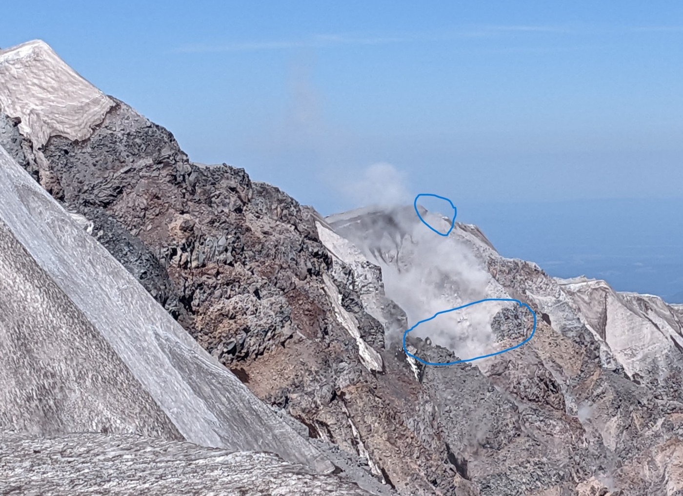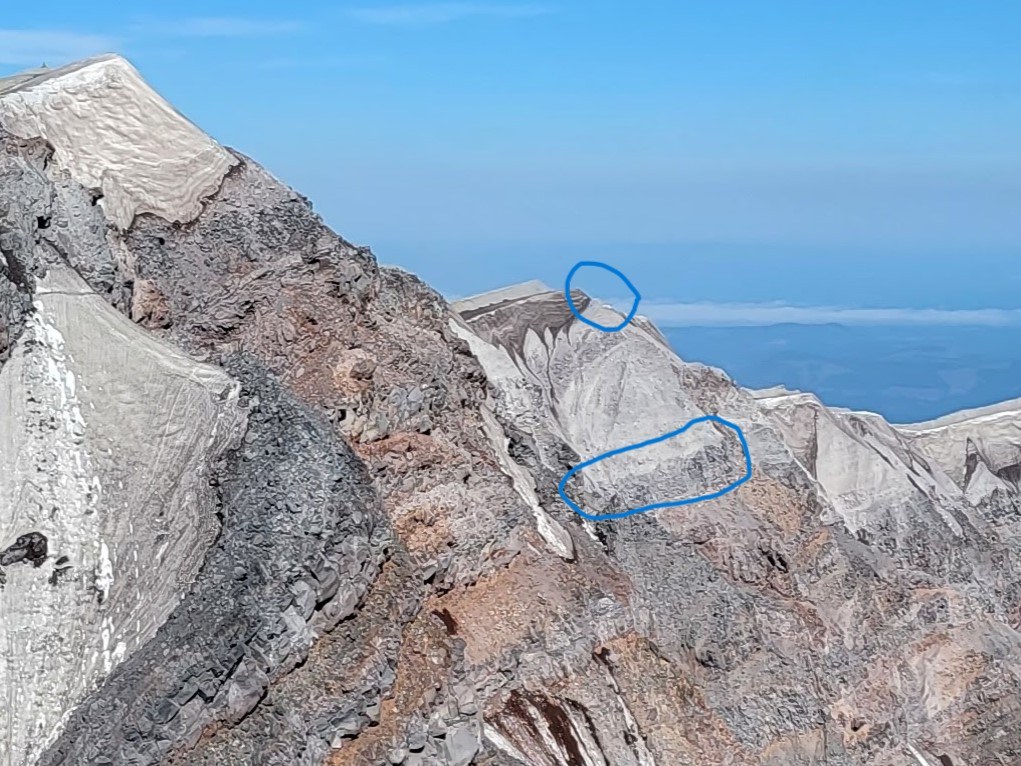 I include this detail because staying climbers' right just above the snow from here made for pretty easy climb. Traversing left around 6900' and staying that side we had an decent walk around to the monitoring station, skipping what appeared to be the arduous boulder hopping up the face of the ridge. Afterwards, popping to climbers' right found us nice, sandy footing for the most part up the knob at 7100'. Rest of the ashy walk was straightforward and nothing different to add.