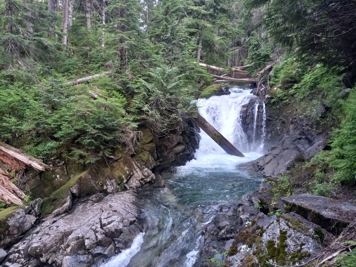 After this crossing is the crossing on the much shallower Sawyer Creek. We got across that easily and made it to a campsite with three tents set up, but we didn't see their owners. We took a break and got back on the trail by 4:30pm. Shortly after this campsite (to the north) is the junction with the Tonga Ridge Trail. This is where the Deception Creek Trail ends (begins for us) in the WTA description of the Deception Creek Trail, and I remembered that it was 5.5 miles from here to the highway. I also knew that there was a great campsite about halfway between this endpoint and the trailhead, so we decided to continue on. Sure enough, after two hours we made it to that fabled campsite by 6:30pm. Along the way we saw the best and loudest river valley waterfall rapids viewpoint in the world, just south of the campsite.