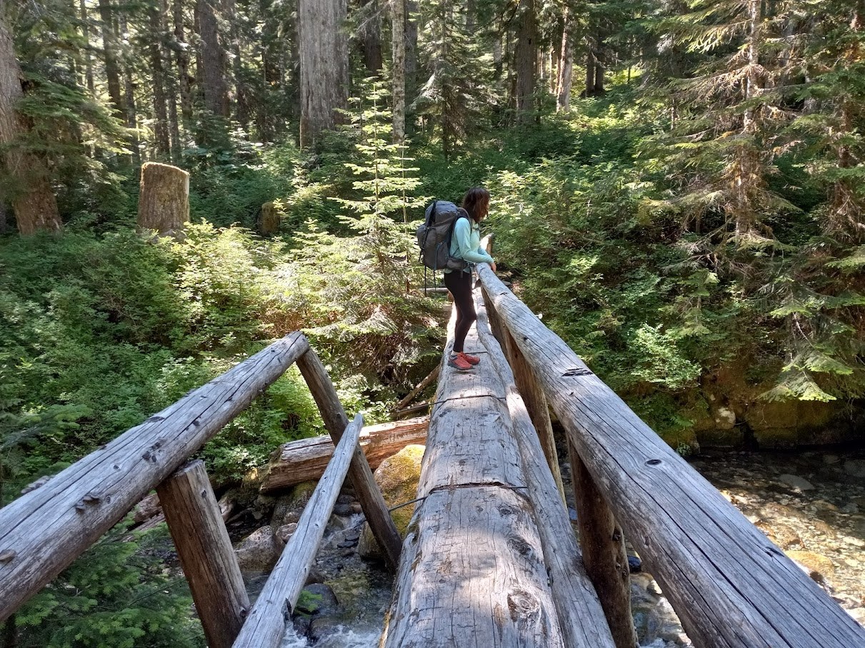 This was the last leg of a backpacking stint on the PCT after we decided to end our trip early due to injury. We hiked from the PCT camp at Deception Lakes to the campsite about two miles from the highway on the Deception Creek Trail, then hiked to the highway the next morning to get a ride. It was about 10 miles total, we believe, most of it the first day. This hike required climbing, crawling, and clambering through more than a dozen blowdowns, a few of which required us to go packs off. The trail was also quite overgrown, and to get to the junction with the Tonga Ridge Trail required two river crossings. Still, this is one of my favorite trails.