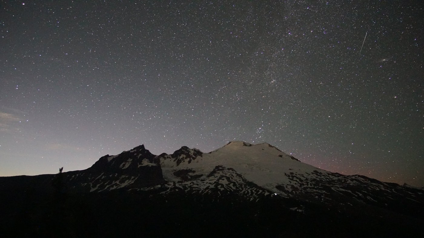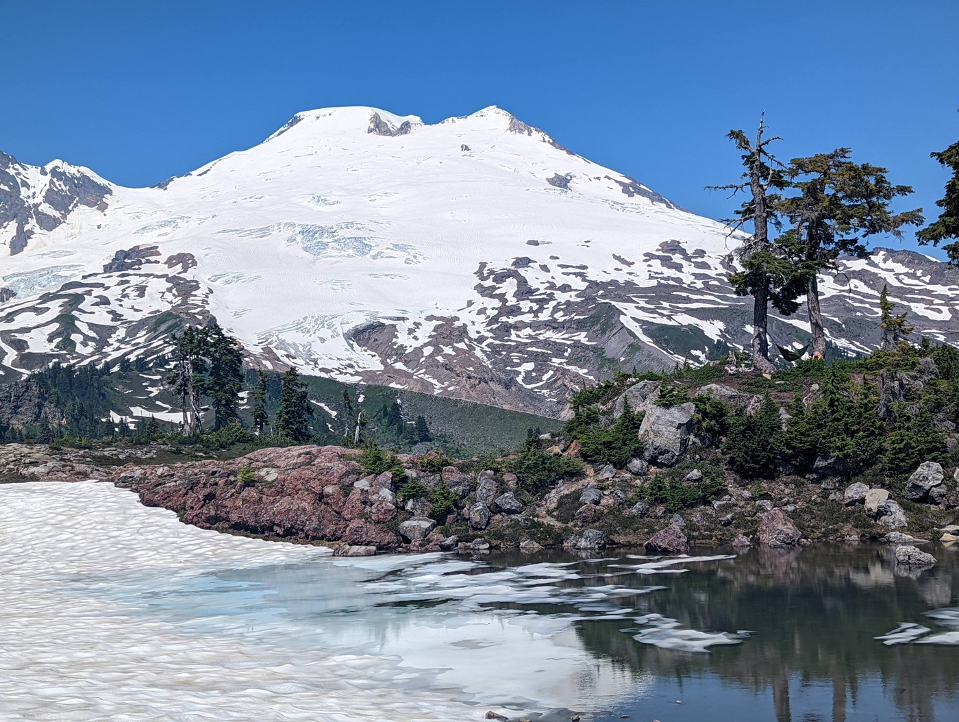 Trail: The trail had some muddy parts, but nothing unmanageable. Had no problems with the creek crossing. Be sure to read the signs at the junctions since the trail splits off a few times - I ran into someone who made a wrong turn and ended up doing the Scott Paul Trail before returning to do the Park Butte Trail (he missed the sunrise hike by a few hours). Once past the Railroad Grade junction, you'll start to feel very close to Koma Kulshan. There is still some snow cover that's been melting fast in the heat wave. Parts of the trail from here are covered in water/snow but I didn't have a problem with walking through them since I had waterproof boots and hiking poles.