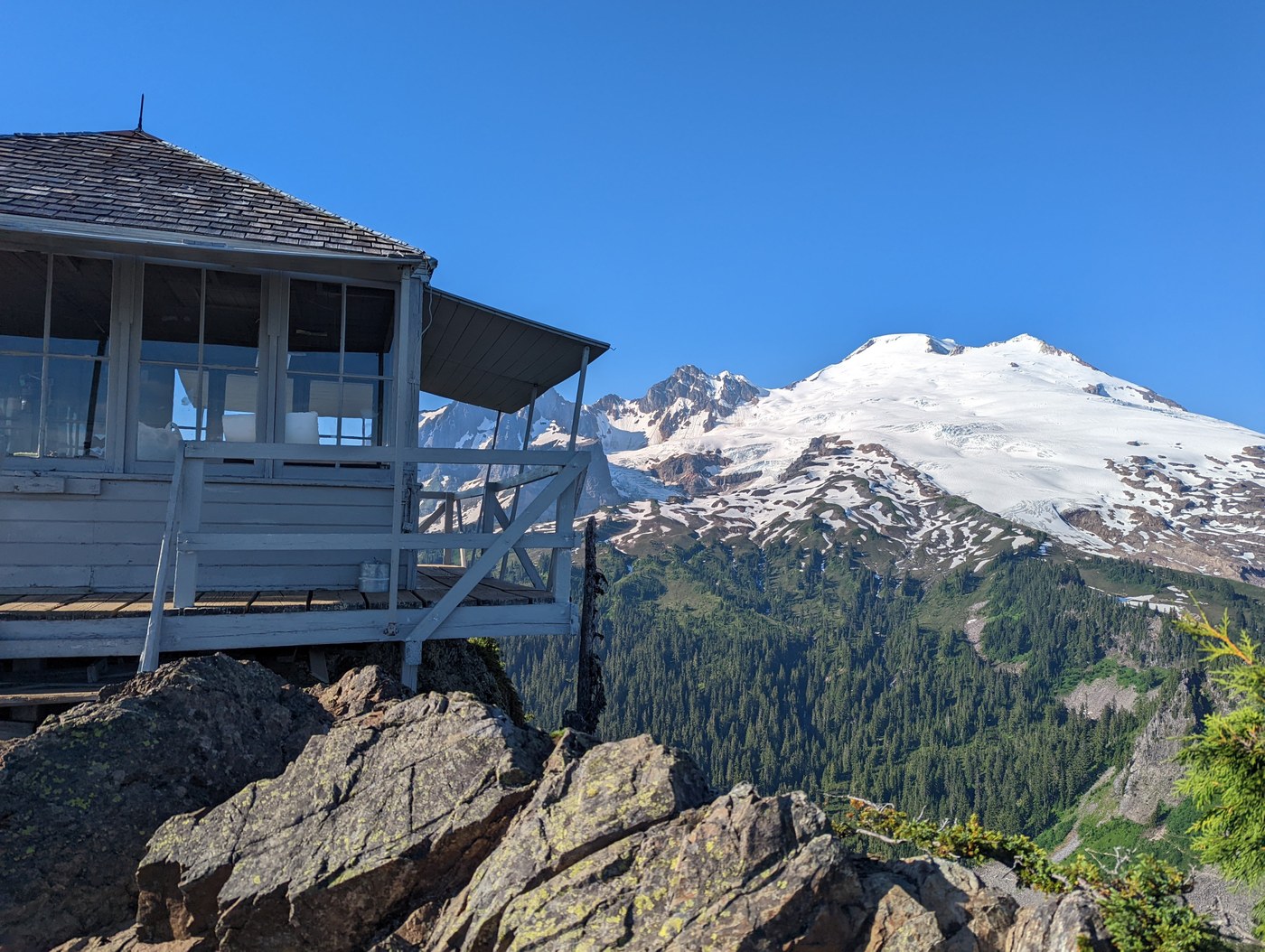 7/28: Left the lookout the following morning at around 7:30am and it was already hot and sunny. The snow on the trail melted even more from the previous day. I'm sure all the snow will be gone from the trail in the next day or two. The bugs were less than then the previous day (could be because of the earlier start or because my skin was covered this time). Only ran into a trail runner on the way down and no one else until I was partway through the forested area. Crossed paths with a group that were on their way up to summit Koma Kulshan. Got back to the TH just before 10am to a very cool car (yay for shaded parking!).