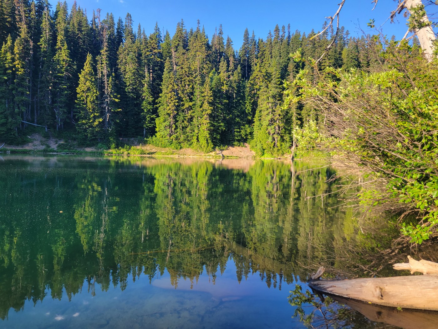 The trail felt very long in this weather and there are several points where blowdowns required a detour (or a belly crawl for one adventurous member of our group). Social trails around the obstructions were usually fairly obvious. Several forks in the trail also required some discussion but to make it easy, we turned left after the gate, then right, then took left forks the rest of the way to the lake.