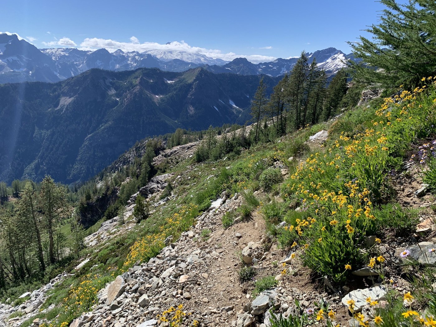 Basically flat along the Phelps Creek Trail with small stream crossings, easily passible for a short-legged person and keeping toes dry. At 3.5 miles, we turned up the Leroy Creek Trail to ascend steeply on the dusty trail, with some larger rock steps, until gaining views of Seven Fingered Jack, Mount Maude and Glacier Peak and meandering through alpine meadows in bloom. Gnats and a few mosquitoes were present above 6,000', and massive horseflies started buzzing us around Freezer Pass above 7,000'.