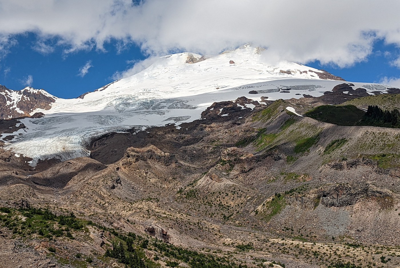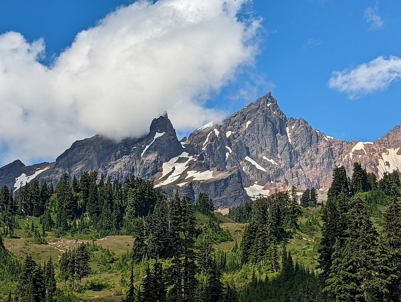 What a beautiful day for a beautiful hike. The area at the top has better views of Baker than you get of Rainier from Paradise. The first mile or so, up to the seasonal bridge over Rocky Creek, is fairly level and easy. But the next mile, from Rocky Creek to the meadow, is relentlessly up, and also the buggiest part of the hike. Stick it out, though, because even the views from the meadow are worth it. You can see Glacier Peak and many others of the North Cascades to the south and southeast, and the tops of Park Butte and the Black Buttes are prominent. But this hike is all about Koma Kulshan, right there in your face. You walk directly toward it through the meadow to get to the railroad grade proper, and each time you round a bend or crest a hill you see a little more.