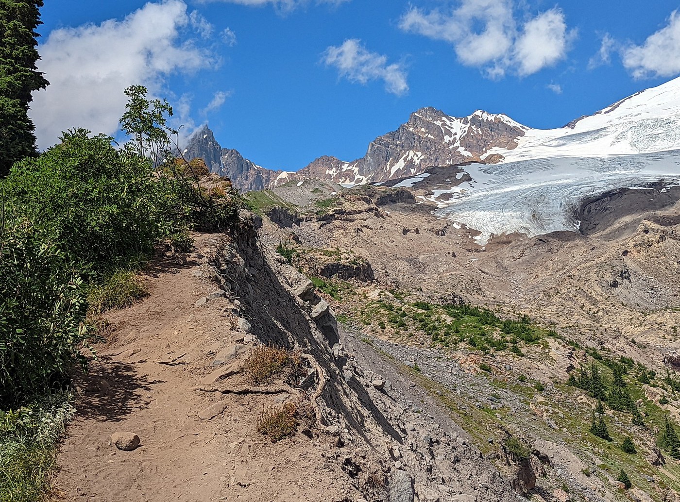 There's a little flower-filled valley right before you climb the railroad grade, and then suddenly you're face to face with rock and ice and snow, and a very steep dropoff. People who say that "if you are afraid of exposure you might have trouble" are understating it. I have only a little trouble with severe exposure, and I was pretty weak-kneed, especially at first. The trail runs right along a steep (and quite crumbly) drop for much of its length. I went far enough to see the end of the trail, and it didn't get any better, and the views were only a little more close-up. Also, it's fairly narrow and I was having trouble passing people going the other way. Between the stress and the diminishing returns, I took my photos and turned around, probably a mile shy of the end. YMMV.
