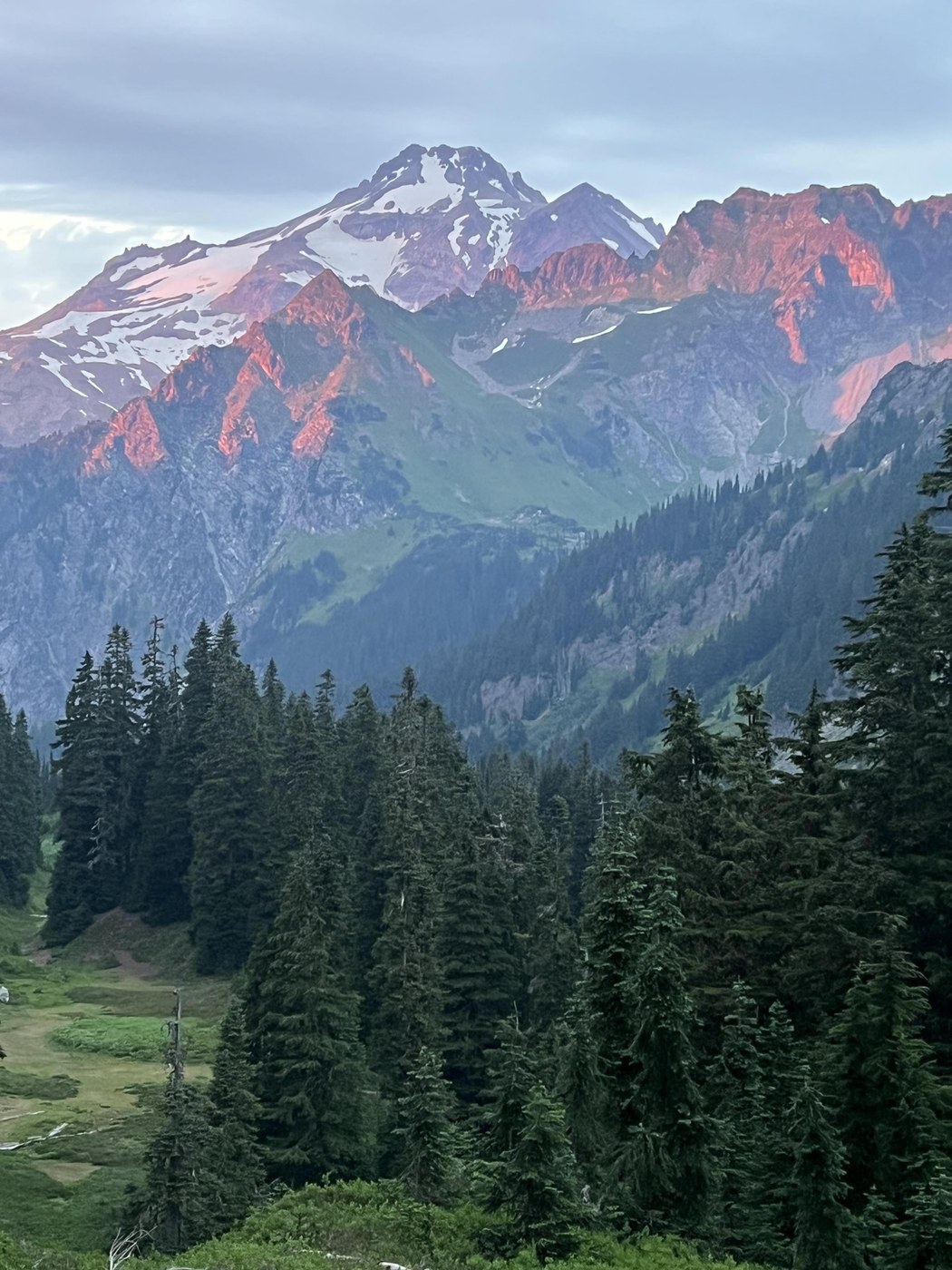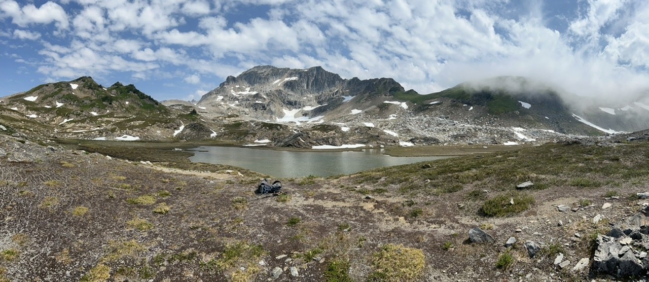 N Fork Sauk is a busy trail. Camped first night near the fallen shelter at the base of the ridge climb, away from the crowds deeper in the woods. Few bugs. It’s nice to climb to the PCT early in the morning, it would be a long grind in the sun. Saw a bear about a 1000 feet below the PCT, about a 100 feet off the trail in the meadows where there are lots of ripe blueberries. The bear was happy and ignored us. The ridge walk to Red Pass is awesome. The hike down to Glacier Meadows is also stunning. Few shady camps and lots of folks show up after 4. There is a nice camp on the hill near the privy and a great camp down in the valley floor in a cluster of trees if you are going to Glacier Gap. Trail to the Gap is straightforward but intermittent. Stay right of the first two waterfalls and between the two waterfalls below the final climb to the lake near the Gap. The right side waterfall is the outflow stream from the lake. A compass bearing is useful if you’re confused. The climbing route from White Pass to the Gap is obvious at that point if you want to make a loop. Bugs were intermittently bad at the meadows. Blueberries ripe at around 5000 feet but not along the PCT. A beautiful hike! It took us 6 hours to go all the way from Glacier Meadows back to the car.