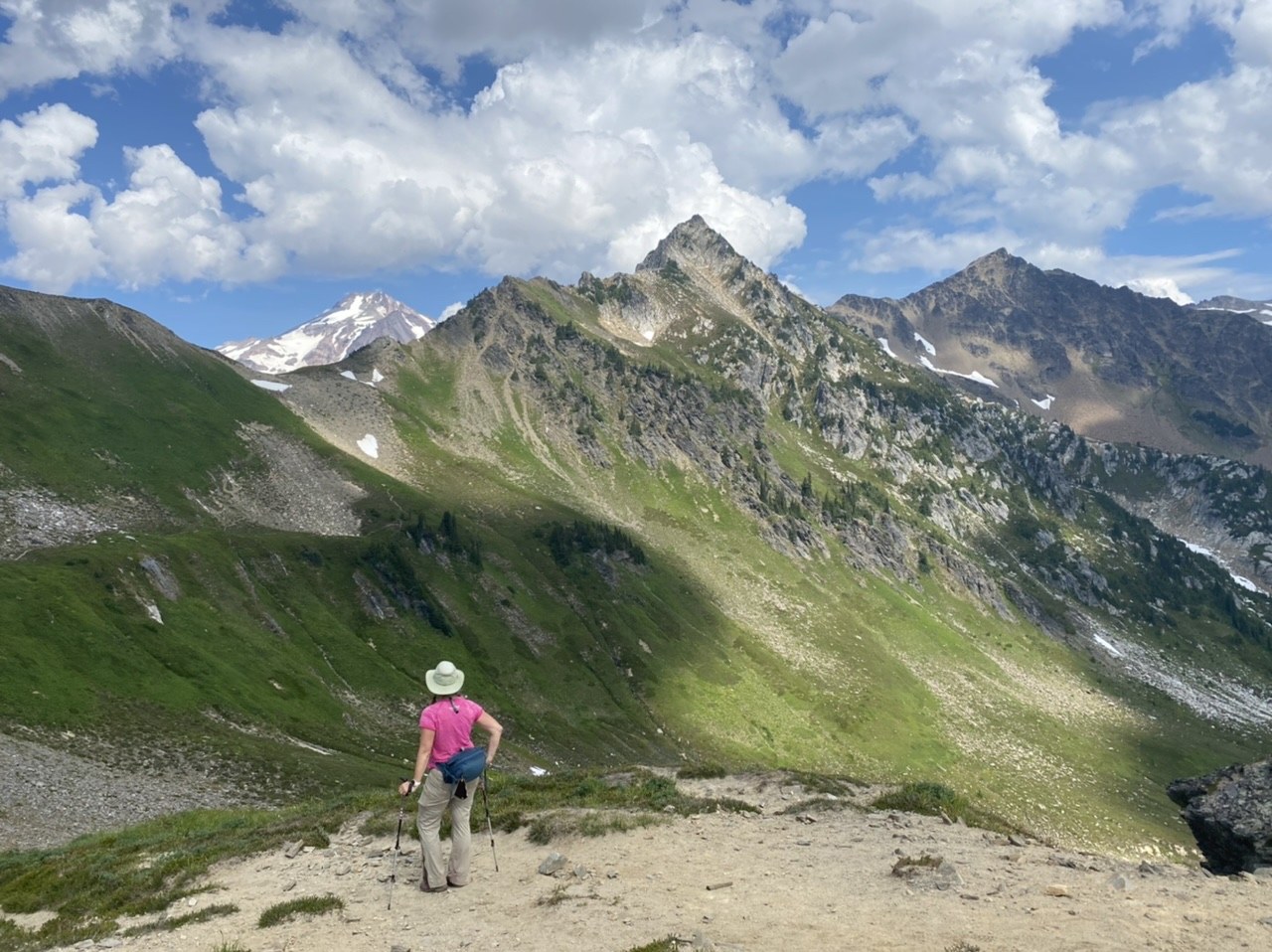 After making camp and a brief lunch we headed out to explore with just light day packs. The Foam Creek trail is popularly used by those climbing Glacier Peak. This well graded trail ambles a bit less than two miles, traversing moss and flower studded drainages. Several short snow gullies needed to be crossed that might be difficult for some. We eventually turned around at a high point with dramatic Glacier Peak views. Returning to White Pass we head north on the PCT, chatting with through hikers on their way to Canada. Most are pretty honed by this point, one telling us that the remaining 150 miles would take him five days to complete. It seems almost a shame to blow through such beautiful country, laden with berries as it is, at such a clip. It is their trip though and I imagine at some point you just want to get it done.
