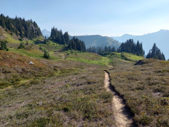 Started at 7:30 am to try to beat the heat. Didn't really work, it was already hot by the 2nd mile, though I'm sure it would have been worse later in the day. Couldn't beat the smoke, either - I didn't smell it and breathing wasn't hard but visibility was definitely reduced. That being said, even a so-so day in the North Cascades beats a good day at work. The berries were everywhere - my fingers were purple by the time I turned around, 1.5 miles along the High Divide. There were some bugs, but they weren't too bad if you kept moving, and once I got to the pass there was a breeze that kept most of them away.