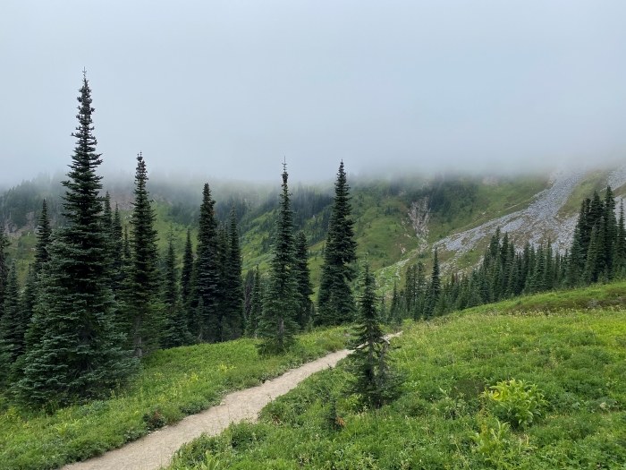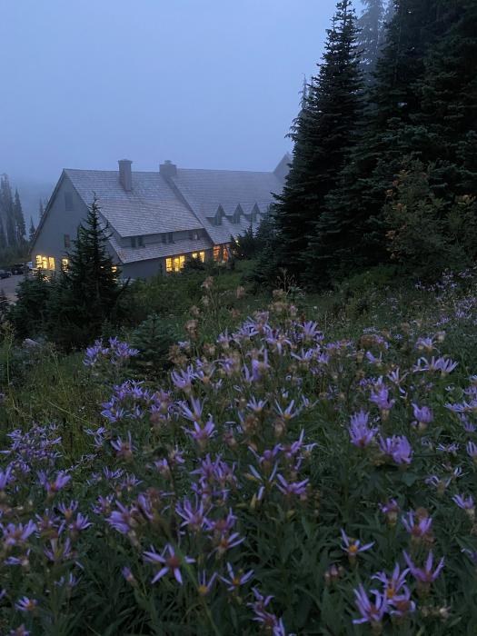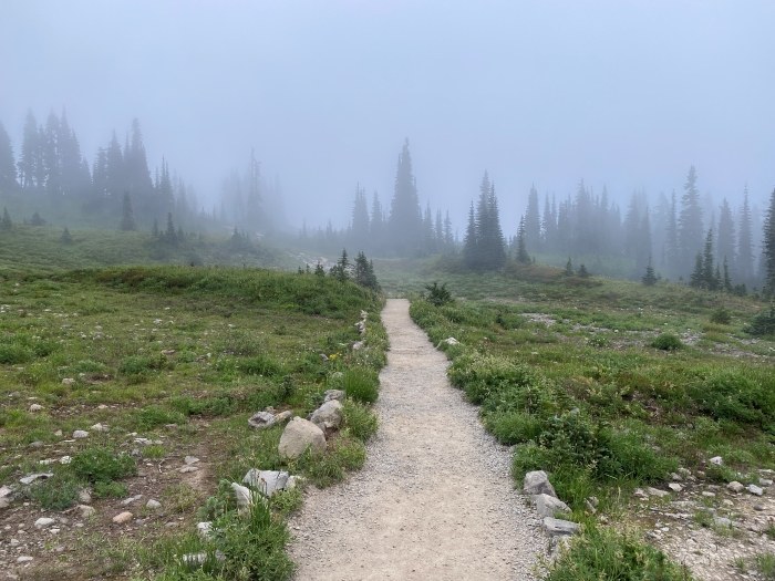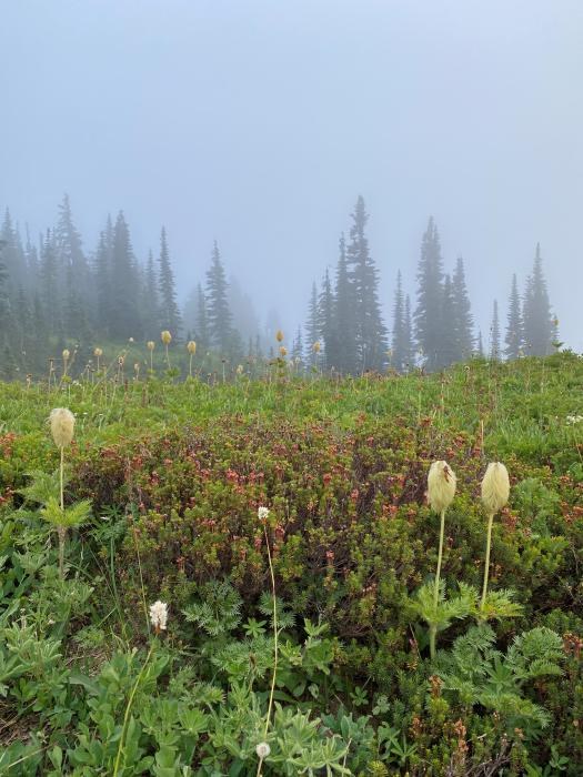 The Mountain was not out for us this day, but hiking in the fog has its own beauty. As you make your way through the major viewpoints early in the trail (in both directions), the crowds thin a bit, but I still can't believe how busy the park has been lately. SO many people just walking off trail and putting out a picnic blanket, smoking, bringing dogs, ignoring signs trying to protect the fragile meadows. Sigh. The trail is well worn and easy to follow, just keep an eye out for signs to stay on track as many other trails branch off from Skyline. Definitely bring bug spray, they can really swarm when you stop moving, and plenty of water as the elevation gain heats things up. The wildflowers are just about spent, but there are still aster, pearly everlastings, daisies, and the occasional paintbrush brightening the trail.