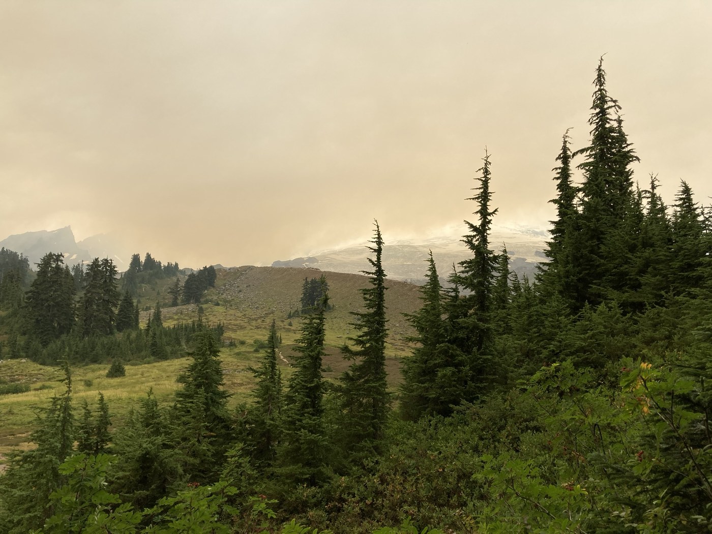 - Smoke: Thick to the south on Saturday but Mt. Baker itself was clear and the air felt clear at Railroad Grade until late Saturday afternoon. Mt. Baker and the surrounding peaks all disappeared in smoke at 4:30pm Saturday as it blew in on a continuous south wind. Smoke remained the remainder of the evening. North breeze overnight cleared the air around Baker and Railroad Grade for good views but it got smokier on the way down and out.