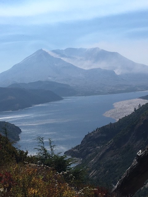 Before checking into our weekend camp (OK, cabin) at Ike Kinswa State Park, we decided to do a short lunch hike, since it has been years since we viewed Mt. St. Helens from the northeast side. Norway Pass checked all the boxes, so off we went, down Road 25 (a free amusement park ride) and Road 99 (MUCH better, thank you) to the short bit on Road 26 to the Trailhead. It was mostly sunny with temps in the upper 60's, perfect hiking weather. Unfortunately, this was the day that high level forest fire smoke started to descend on western Washington AND the day that the Packwood fire accelerated, so smoke was interfering with views by the time we returned to the trailhead. At 11:45 AM there were four cars at the trailhead, one belonging to the back-country ranger we met ten minutes into the hike. Bees found us right away, but the slight breeze and a bit of hand-waving took care of them.
