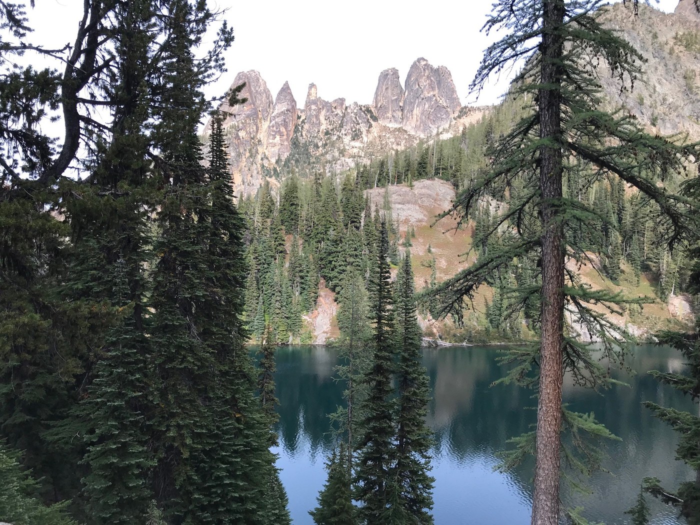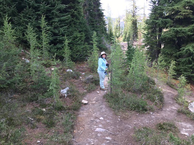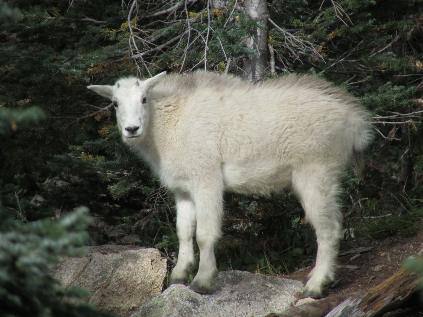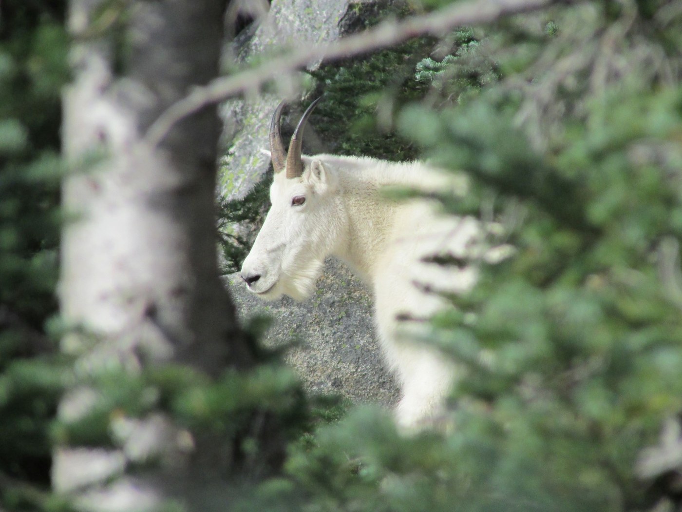 Getting a late start on a Saturday, the parking lot was full and just as many cars were parked along the highway. From that we expected to find a mob but it seemed like everyone was spaced out so they were not overwhelming. The day was cool and just perfect for hiking without working up a sweat. The trail is in very good shape with very few rocks and roots, no downed trees, and the grade is pretty gentle. There are a couple of muddy steps right at the trailhead but the rest of the way was dry. Near and at the lake, the forest service has set up multiple signs and ropes for vegetation restoration. Please respect them. At the lake the trail forks and most take the right fork to a large rock with great views of the lake and surrounding peaks. We could also see numerous (small) fish jumping and, if the light was right, swimming. From the rock, we backtracked about 200ft to the signed junction for a Tarn Loop trail that is highly recommended. You get some elevation above the lake for great views of the lake and peaks. The larch trees were a pale green color with a few barely starting to show their fall color. Maybe 2-4 more weeks before they are brilliant gold? On the return hike, near the Liberty Bell trail junction, we saw a mountain goat and her kid right on the trail. They headed off into the woods and when we next saw them they had climbed quickly up the hillside above us. Pretty cool. As an added bonus for the day we stopped at the Wildlife Viewing site west of Concrete where about 25 elk were grazing at sunset.