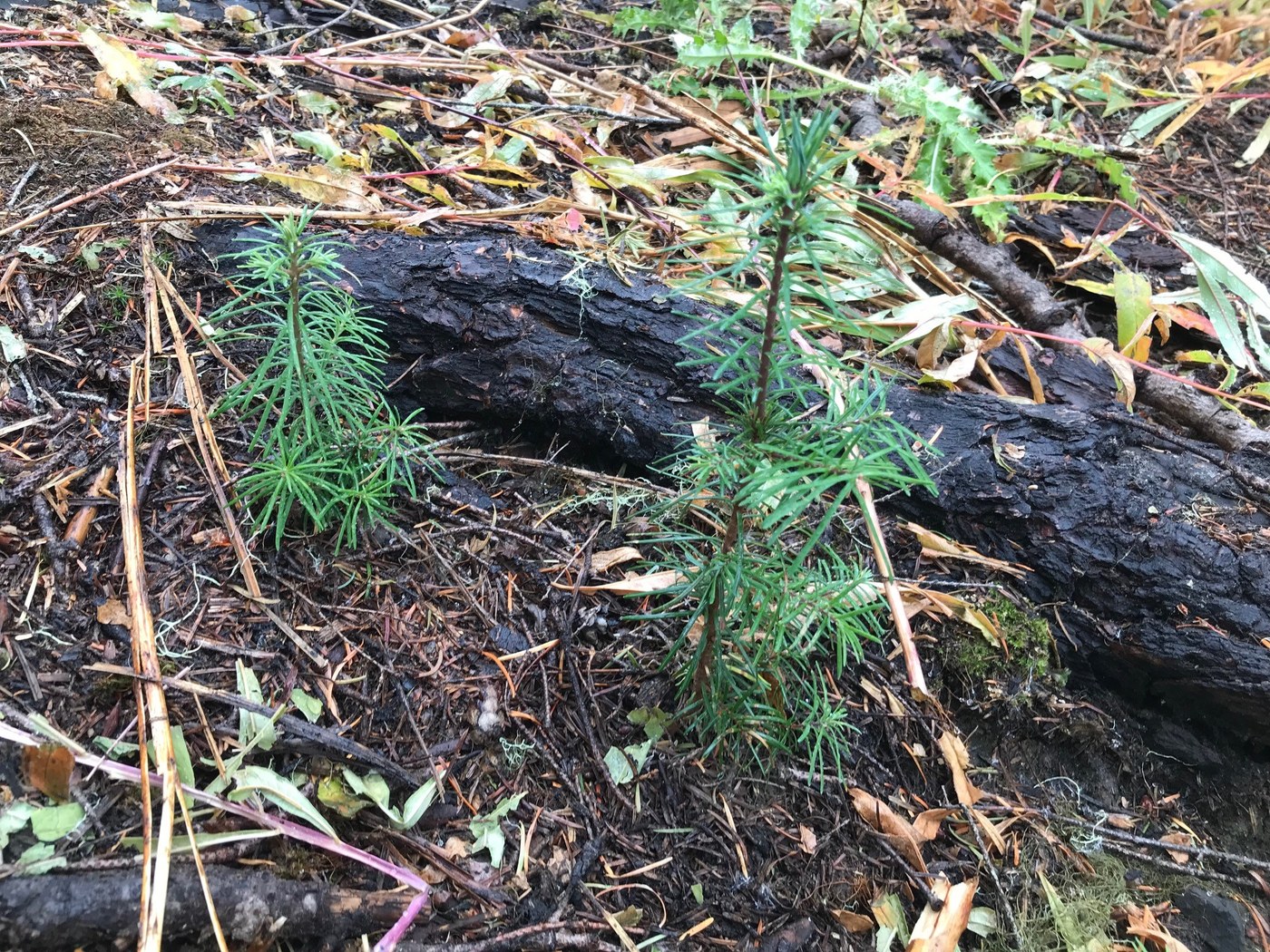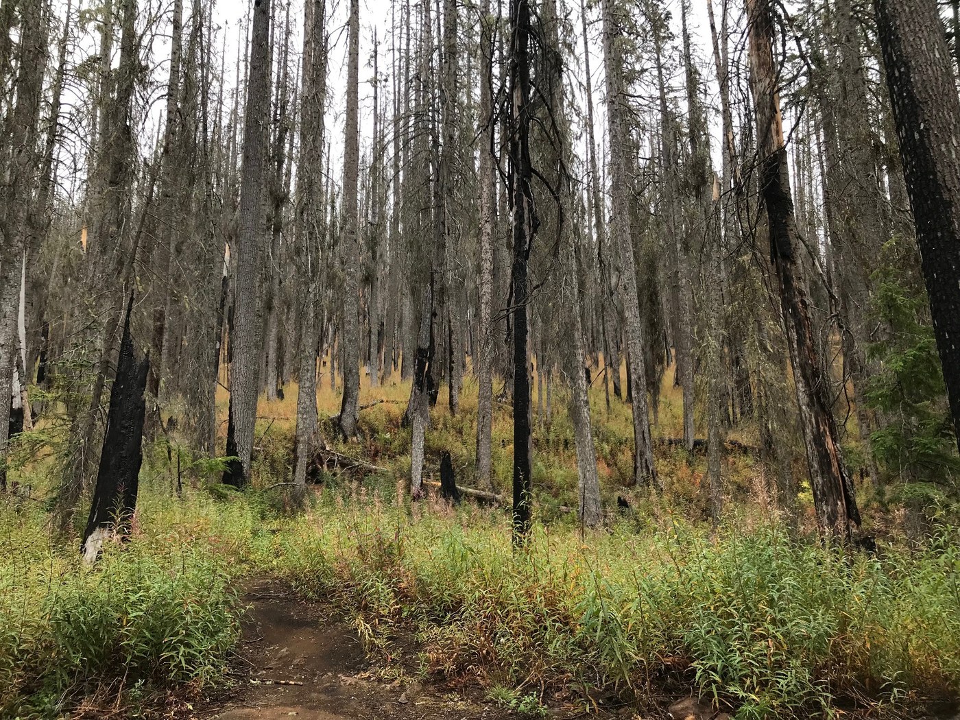 Shortly after the last viewpoint we entered the burn area with acres of damp fireweed and some new douglas-fir seedlings popping up. Thank goodness for quick dry pant legs. The (Norse Peak) burn area is mostly along a ridge line with some steep drop-offs on the right side. Probably not a good place for overactive children or unleashed dogs. There were numerous downed trees even though there were just as many cut earlier this year. So they are still falling and it would be best to always be aware and avoid on a windy day.