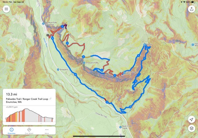 There would be fabulous views on a clear day above the Palisades cliffs. Unfortunately, this day was overcast with a touch of light drizzle. We could only see the other side of the valley, and further up the valley (most of the time). The cool weather did make the uphill hiking more pleasant than on a hot summer day. At the last viewpoint, 2 of us decided to continue with the loop on the Ranger Creek trail for a total of about 14 miles.